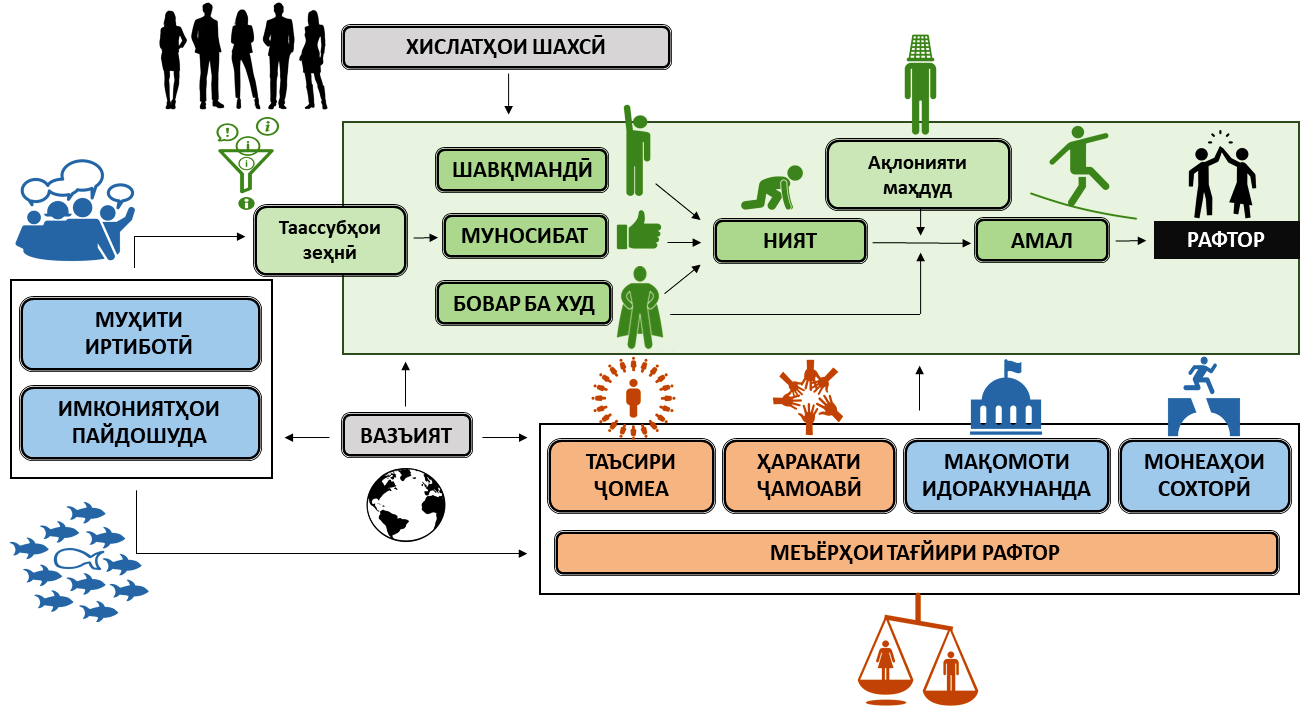 Ҳар яке аз ин омилҳо ба меъёрҳои мувофиқ тақсим шуда, барои фаҳмиши масоили зерин мусоидат менамоянд: чаро одамон чунин рафтор мекунанд, на ба таври дигар, чӣ барои тағйири муносибати онҳо муҳим аст – хислатҳои гуногуни шахсӣ, робитаҳои хонаводагӣ, меъёрҳои суннатӣ, ақидаҳои қолабии ҷамъиятӣ, механизмҳои мавҷудаи ниҳодӣ.