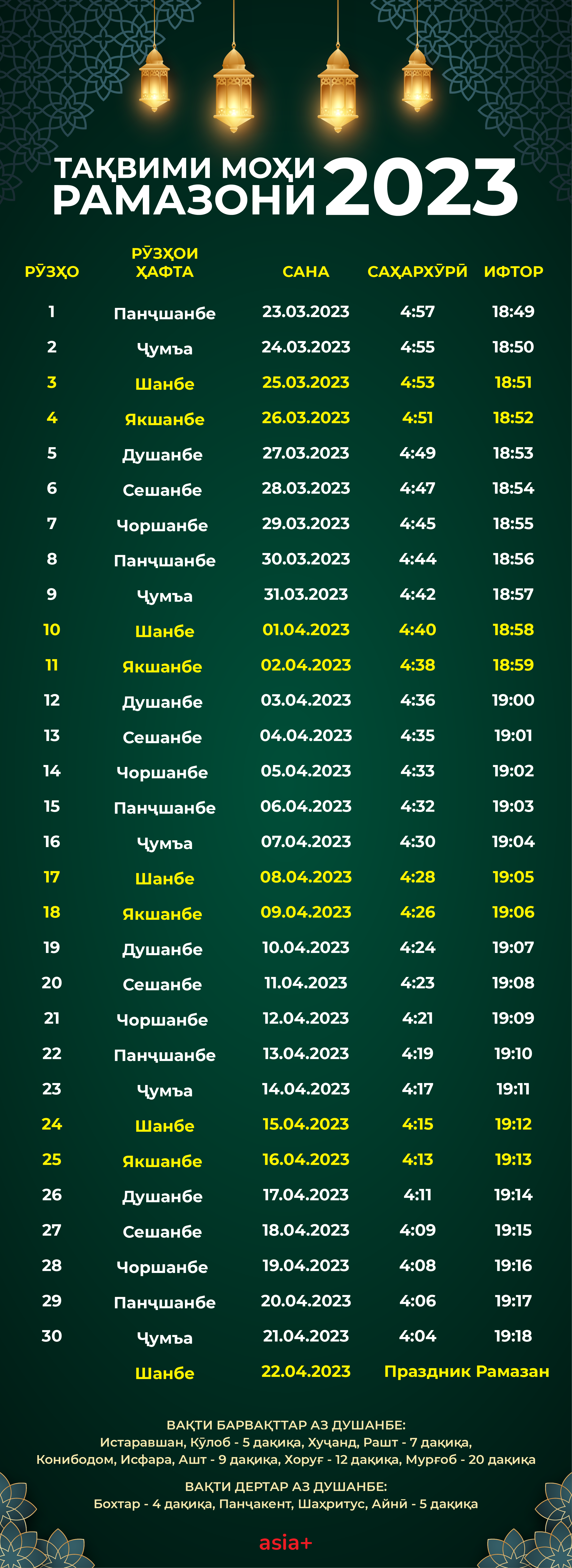 Тавре ба “Азия-Плюс” аз Кумитаи дин, танзими анъана ва ҷашну маросими ҷумҳурӣ иттилоъ доданд, тибқи далелҳои илмӣ, моҳи Рамазон дар Тоҷикистон 23-юми март фаро мерасад.