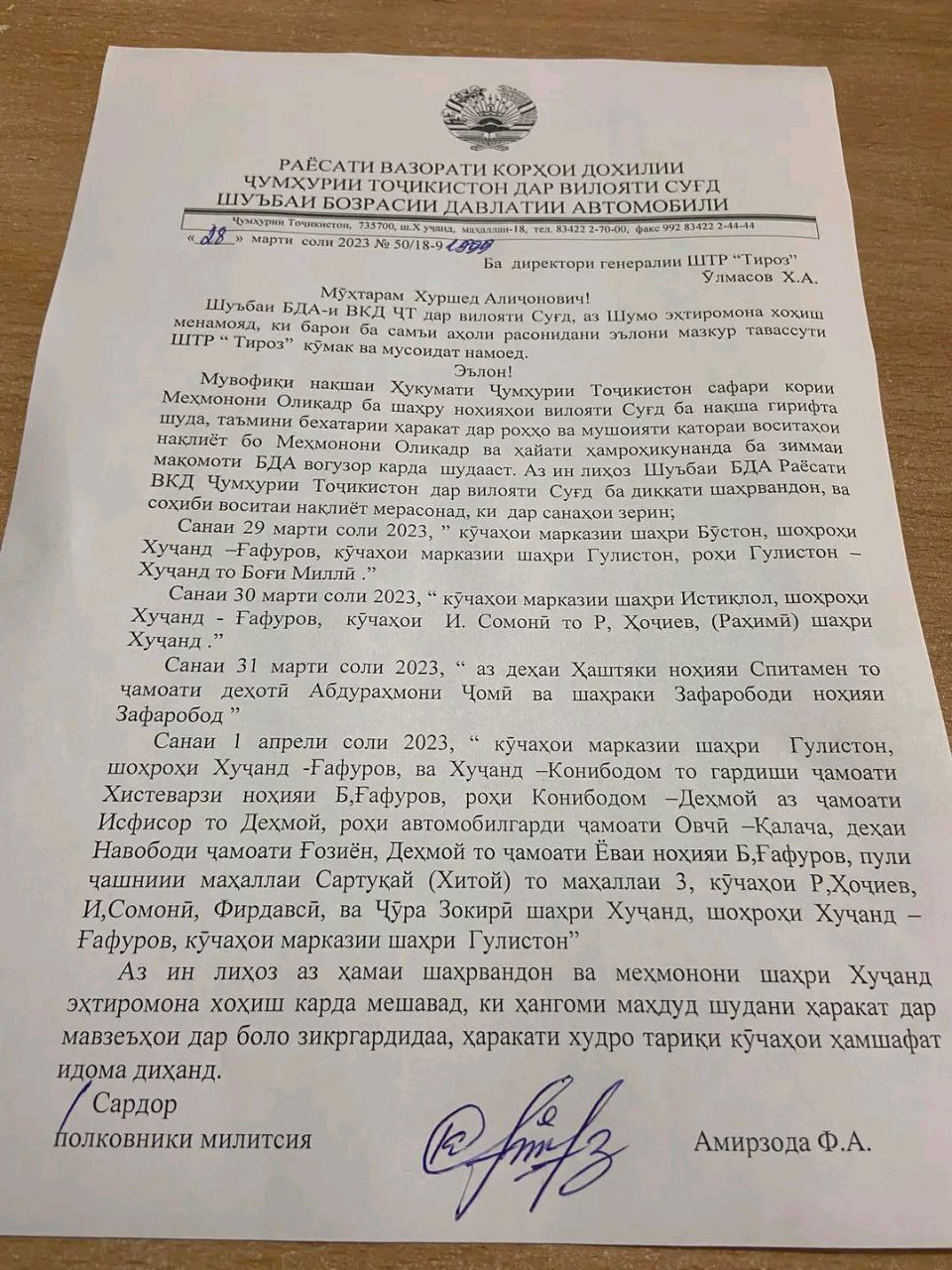 Дар робита ба ин, Шуъбаи БДА-и вилояти Суғд хабар медиҳад, ки аз 29-уми март то 1-уми апрел дар роҳҳои вилоят маҳдудияти ҳаракат дар роҳҳо ҷорӣ карда мешавад.