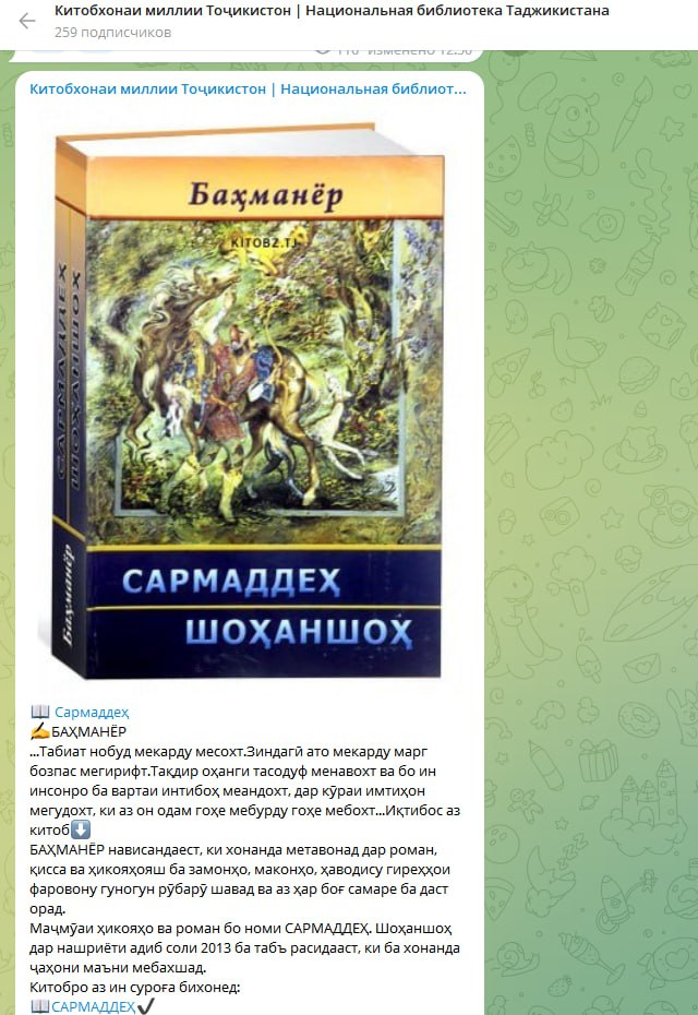 “Ҳамарӯза барои дастрас кардани китобҳои гуногун дархостҳои зиёд мегирем. Мебинем, ки хонандаҳои имрӯз, назар ба боргирӣ кардан аз саҳифаҳои гуногуни интернет, майл доранд, аз телеграм-канал дархосташонро бигиранд. Мо ин ниёзро аввал омӯхтем ва сипас ба қароре омадем, ки саҳифаи худро дар Телеграм фаъол кунем”, – гуфт ҳамсӯҳбати мо.