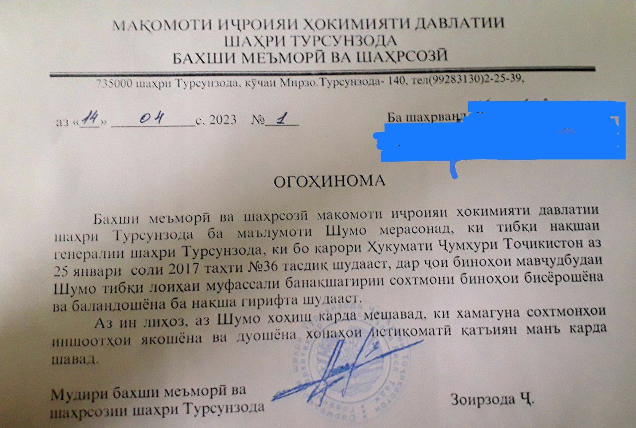 Мақомоти шаҳри Турсунзода сокинони маҳаллиро огоҳ кардаанд, ки сохтмони биноҳои иловагиро дар назди ҳавлиҳои худ қатъ кунанд. Гап дар сари он аст, ки тибқи нақшаи генералии шаҳр, ки ҳанӯз соли 2017 тасдиқ шуда буд, дар ин қитъа бино ва иншооти муосири бисёрошёна сохта мешавад.