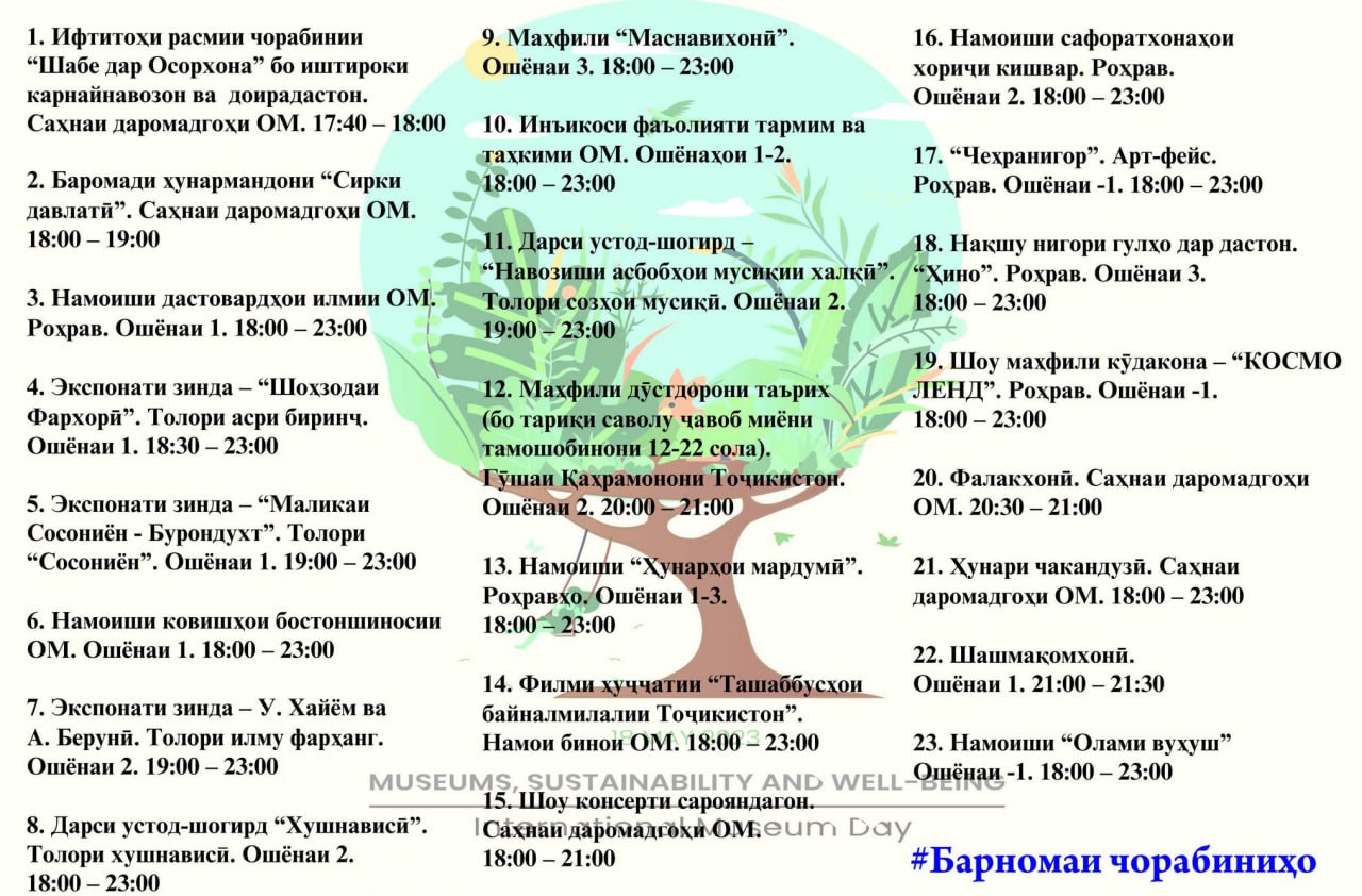 Ба иттилои саҳифаи фейсбуки Осорхонаи миллии Тоҷикистон, дар доираи баргузории иқдоми байналмилалии “Шабе дар Осорхона” 24 маҳфили фарҳангӣ, маърифатӣ ва оммавӣ гузаронида мешавад.