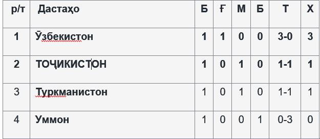 Дар бозии дигари даври якуми ин гурӯҳ мизбони мусобиқа – мунтахаби Ӯзбекистон бо ҳисоби 3:0 бар дастаи Уммон дастболо шуд.