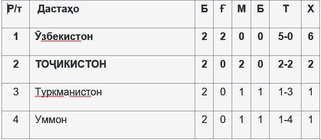 Мунтахаби Тоҷикистон соҳиби 2 имтиёз ва дастаҳои Уммону Туркманистон 1-имтиёзӣ доранд. Мавқеи ниҳоии дастаҳо дар ҷадвали гурӯҳи “А” пас аз даври сеюми охирин маълум мешавад.