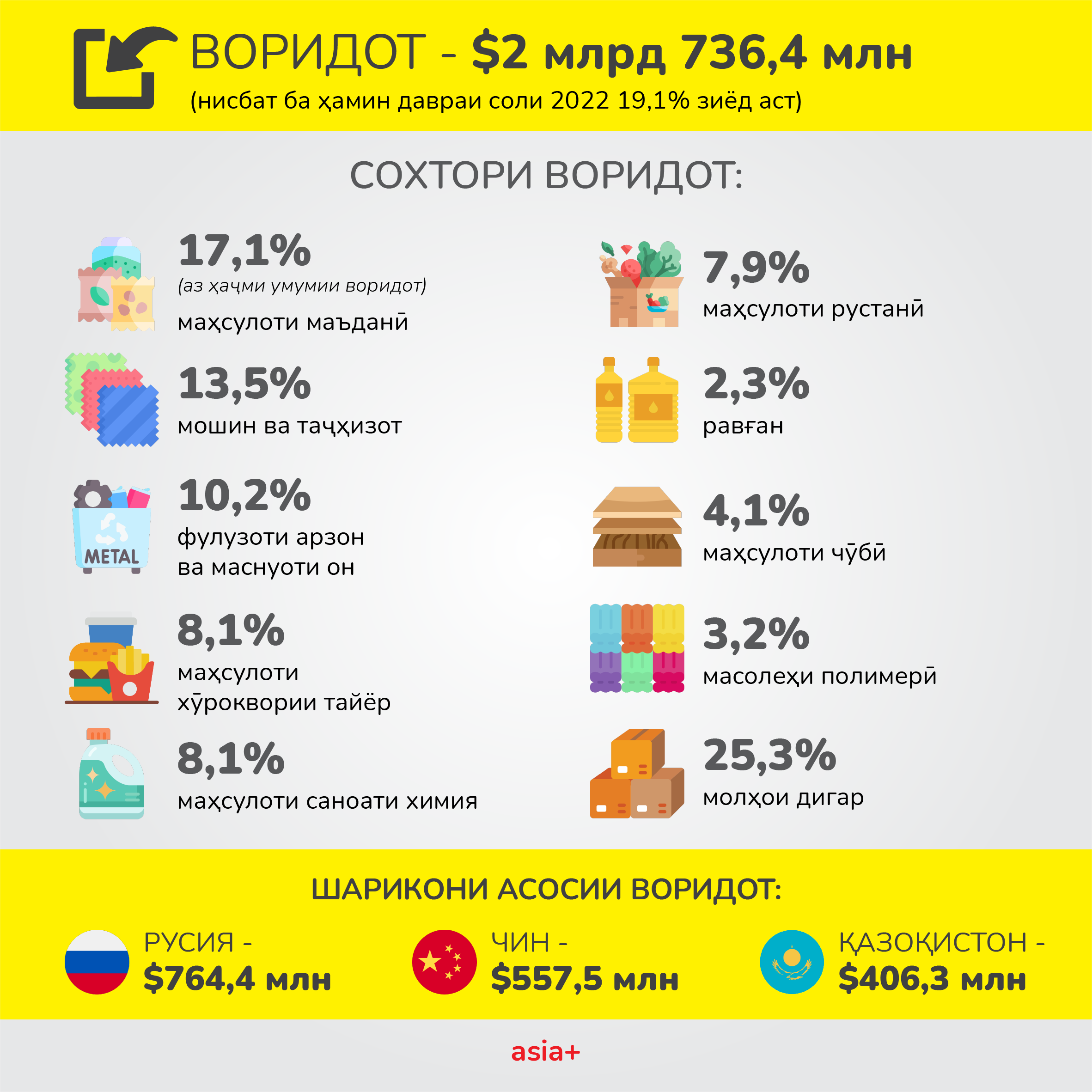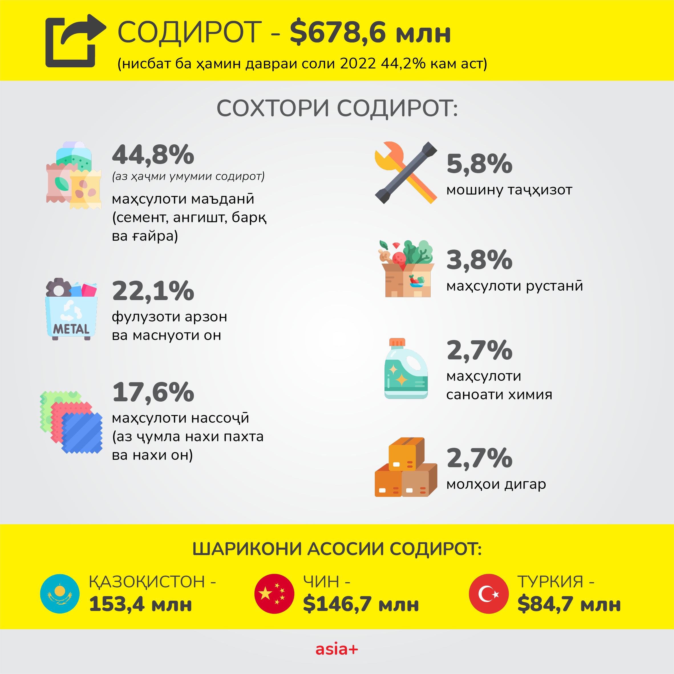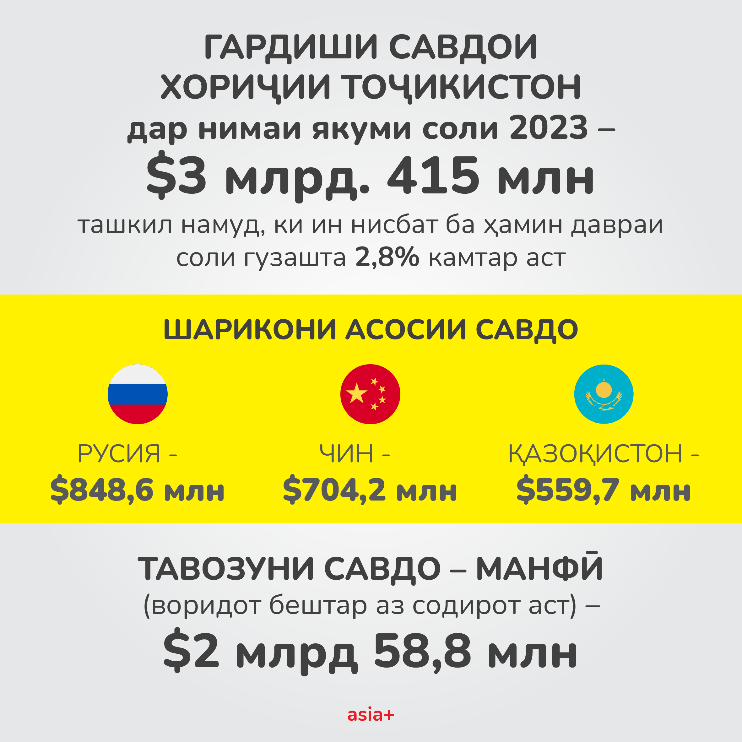 ИқтисодХабар Тоҷикистон бо кадом давлатҳо савдо кард ва аз содироти маҳсулот чӣ миқдор фоида ба даст овард? 3807 Пайрав Чоршанбиев, Asia-Plus 01.08.2023 FacebookXPinterestWhatsApp Гардиши савдои хориҷии Тоҷикистон дар нимаи якуми соли 2023 3 млрд. 415 млн долларро ташкил намуд, ки ин нисбат ба ҳамин давраи соли гузашта 2,8% камтар аст. 1 of 3 Дар Telegram, Facebook, Instagram, OK ва ВК бо мо бимонед. Мавод ба ин забонҳо дастрас аст: Рус Тоҷ Previous articleВазир гуфт, ки Тоҷикистон чӣ қадар нафту газ истихроҷ кардаастNext articleВазорати кишоварзӣ роҳҳои арзон кардани маҳсулоти кишоварзиро медонад? Маводҳои монанд Ҳусиҳои Яман бо партоби мушак ба Исроил расман вориди ҷанг бо ин кишвар шудаанд Дар маҷлиси навбатии ҳукумат омодагии кишвар ба мавсими тирамоҳу зимистони соли 2026-2027 баррасӣ шуд Боздид аз Оромгоҳи Исмоили Сомонӣ ва Қалъаи Бухоро. Эмомалӣ Раҳмон дар Бухоро кадом мавзеъҳоро зиёрат кард? Пурхонанда Аз оғози кушторҳои пайдарпай дар Конибодом ду сол гузашт. Ангезаи кушторҳо чӣ буду гумонбарон чӣ ҷазо гирифтанд ва чанд кас кушта шуд? Ҳусиҳои Яман бо партоби мушак ба Исроил расман вориди ҷанг бо ин кишвар шудаанд Дар маҷлиси навбатии ҳукумат омодагии кишвар ба мавсими тирамоҳу зимистони соли 2026-2027 баррасӣ шуд Аз ваъдаи суқути низом то илтиҷо барои бозгушоии Ҳурмуз. Аз оғози ҷанги Амрикову Исроил бо Эрон як моҳ гузашт Субҳ ба хайр, Тоҷикистон! Як рӯз дар таърих, зодрӯзи шахсиятҳо, вазъи ҳаво барои 28 марти соли 2026 Ба мо дар шабакаҳои иҷтимоӣ пайвандед! TelegramInstagramFacebookTiktokYoutube Реклама на asia + Ахбори тоза Аз оғози кушторҳои пайдарпай дар Конибодом ду сол гузашт. Ангезаи кушторҳо чӣ буду гумонбарон чӣ ҷазо гирифтанд ва чанд кас кушта шуд? admin - Ҳоло вазъ дар ин шаҳр чӣ гуна аст? Ҳусиҳои Яман бо партоби мушак ба Исроил расман вориди ҷанг бо ин кишвар шудаанд admin - Ин нахустин мушакии Ҳусиҳо ба Исроил аз замони оғози ҷанг алайҳи Эрон аст. Дар маҷлиси навбатии ҳукумат омодагии кишвар ба мавсими тирамоҳу зимистони соли 2026-2027 баррасӣ шуд admin - Дар маҷлиси навбатии ҳукумаи Тоҷикистон, ки имрӯз, 28-уми март... Аз ваъдаи суқути низом то илтиҷо барои бозгушоии Ҳурмуз. Аз оғози ҷанги Амрикову Исроил бо Эрон як моҳ гузашт admin - Дар ин муддат на Амрико ва на Исроил ба ҳадафи аслии худ – суқути низом дар Эрон нарасиданд ва ҳоло ба гирдоби мушкили дигар печидаанд. Субҳ ба хайр, Тоҷикистон! Як рӯз дар таърих, зодрӯзи шахсиятҳо, вазъи ҳаво барои 28 марти соли 2026 admin - Аз оғози кушторҳои пайдарпай дар Конибодом то мавлуди Нақибхон Туғралу Далер Ҷумъа ва Рӯзи ҷаҳонии муаррихон. Боздид аз Оромгоҳи Исмоили Сомонӣ ва Қалъаи Бухоро. Эмомалӣ Раҳмон дар Бухоро кадом мавзеъҳоро зиёрат кард? admin - Рӯзи дуюми сафари Эмомалӣ Раҳмон ба Ӯзбекистон чӣ гуна гузашт? “Фалсафаи инсонмеҳварӣ ва васли инсонҳо”. Чӣ гуна Наврӯз ҷашни ваҳдати миллатҳо гардид? admin - Ҳарчанд, русуму ойинҳои ҳама миллатҳо аз ҳам тафовут доранд ва шеваи ҷашнороӣ низ фарқ мекунад, вале паёми Наврӯз барои ҳама яксон мемонад - расидан ба рӯзи нав, муттаҳидӣ ва оғози фасли тозаи зиндагӣ. Эмомалӣ Раҳмон ба Суғд меравад. Кадом роҳҳои мошингарди вилоят се рӯз баста мешаванд? admin - Эмомалӣ Раҳмон, раисҷумҳури Тоҷикистон бо як сафари кории серӯза... “ICB Арена” дар Душанбе. Сармоягузорӣ ба ояндаи футболи тоҷик admin - Рӯзи 18-уми март дар меҳмонхонаи “Dushanbe Serena” Бонки сармоягузорӣ ва қарзии... “Аудиокитоб” бо Субҳон Ҷалилов. Асари “Таърихи инқилоби Бухоро”-и Садриддин Айнӣ |Қисми 54 admin
