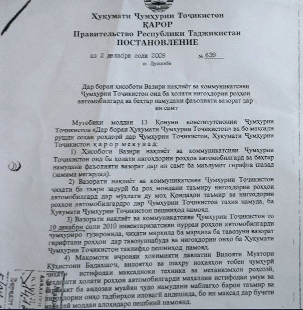 Дар банди 4-и қарори мазкур гуфта мешавад, ки ҳукуматҳои маҳаллӣ ҷиҳати истифодаи мақсадноки техника ва механизмҳои роҳсозӣ, беҳдошти ҳолати роҳҳои автомобилгарди маҳаллии истифодаи умум ва сари вақт ба андозаи муайян ҷудо намудани маблағҳо барои таъмир ва нигоҳдории онҳо тадбирҳои иловагӣ андешида, бо ин мақсад дар буҷети маҳаллӣ моддаи алоҳидаро пешбинӣ намоянд”.