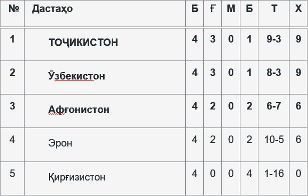 Гуфта мешавад, дастаи наврасони Тоҷикистон дар чемпионати CAFA-2023 чаҳор бозӣ анҷом дода, 9 имтиёз ба даст овард. Наврасони мо бар дастаҳои Афғонистон (3:1), Қирғизистон (4:1) ва Ӯзбекистон (2:0) ғалаба карда, аз мунтахаби Эрон (0:1) мағлуб шуданд.