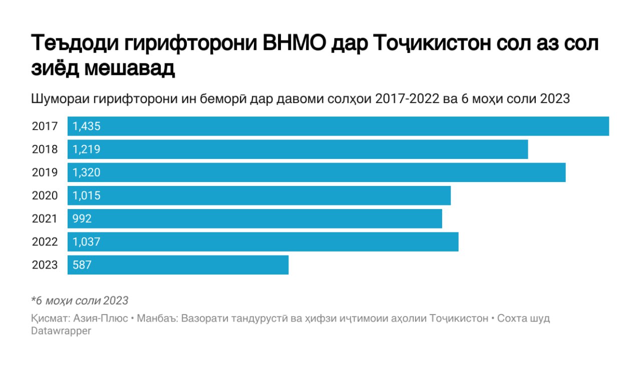 Ҷамолиддин Абдуллозода, вазири тандурустӣ ва ҳифзи иҷтимоии аҳолӣ дар нишасти матбуотии рӯзи 9-уми август гуфт, ки дар 6 моҳи соли равон 479 ҳазор ташхис барои маълум кардани ВНМО гузаронида шуда, дар натиҷа 587 ҳолати нави гирифторӣ ба ВНМО ба қайд гирифта шудааст, ки нисбат ба соли 2022-юм 29 ҳолат зиёд аст.