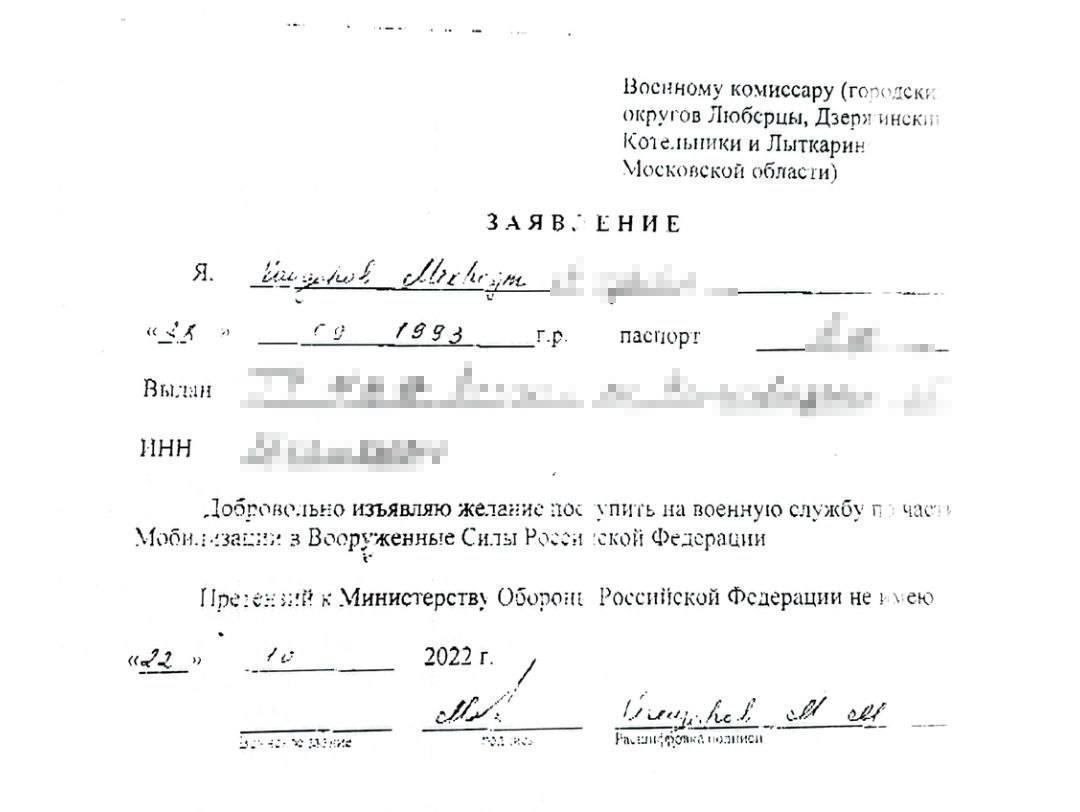 “Кормандони комиссариати ҳарбӣ бо ваъдаи озод шудан аз сафарбарӣ ӯро водор мекунанд, ки “ҳуҷҷатҳои заруриро” имзо намояд. Ӯ ҳуҷҷатҳоро нахонда, варақаи сафарбарии ихтиёриро имзо кардааст”, – менависад ин пойгоҳ.