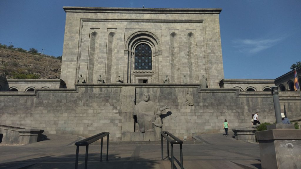 Дар пештоқи бино муҷассамаи Месроп Маштотс, созандаи алифбои арманӣ дар даст алифбояш ҳамроҳи шогирдаш, ҳамчун рамзи таълими устод ба шогирд қомат афрохтааст. Дар ду тарафи даромадгоҳи он, муҷассамаҳои Мовсес Хоренатси, Мхитар Гош, Фрик, Торос Рослин, Григор Татеватси ва Анания Ширакатси, мутафаккирони барҷастаи Арманистони қадим гузошта шудааст. Он расман соли 1959 дарашро барои тамошобинон боз кардааст.