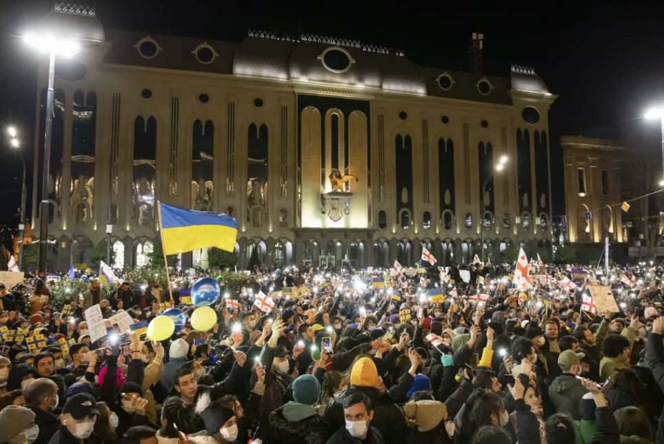 Ҳоло сари ҳар қадам парчами Украинаро вохӯрдан мумкин аст, ки дар дару девор ва дохили тарабхонаву қаҳвахона ва баъзан дар беруни бинои корхонаву ташкилотҳо парафшон аст. Ин як навъ ҳамовозӣ ба аҳолии Укроин ва ҳамин тариқ, эътироз ба амалкарди Русия аст, ки ба андешаи гурҷиҳо, тақрибан чунин амалро 15 сол пеш нисбати онҳо раво диданд. Гурҷиҳо чунин меандешанд, ки маҳз бархурди нарми созмонҳои байналмилалӣ ва кишварҳои Ғарб ба ҳаводиси Оситияи Ҷанубӣ ва Абхазистон сабаб шуд, ки Русия дар соли 2014 Қрим ва ҳоло мехоҳад пурра Укроинро соҳиб шавад.