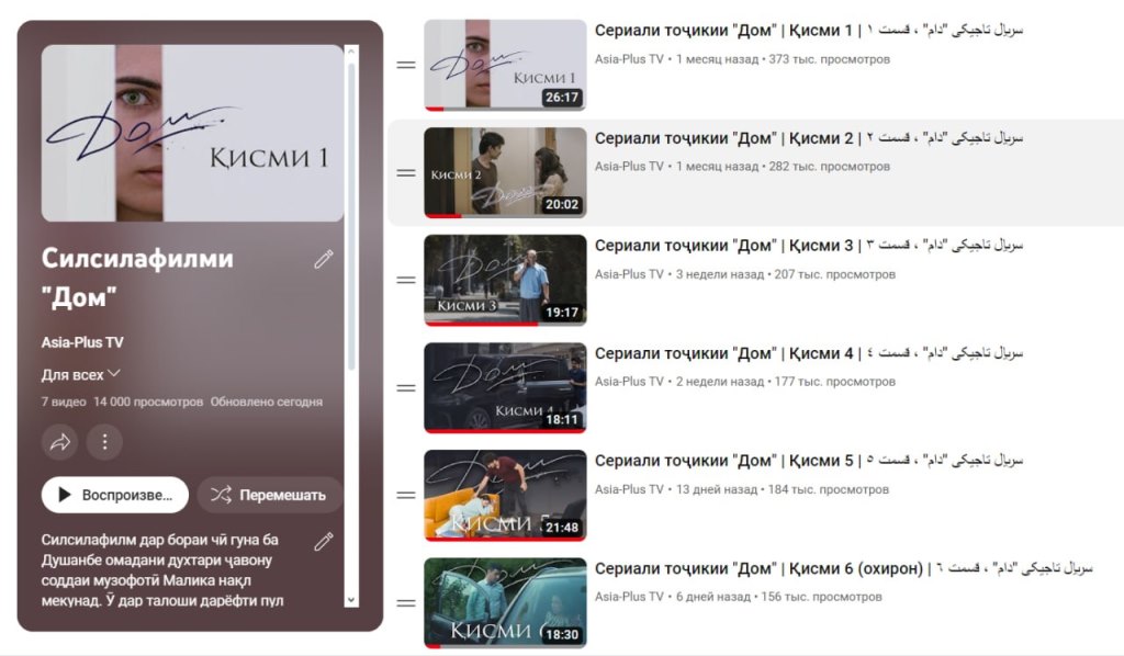 Нахустнамоиши ҳамаи қисмҳои силсилафилми “Дом” ба анҷом расид ва ҳамакнун, ин филмро дар шакли пурра метавон дар саҳифаи “Азия-Плюс” дар шабакаи YouTube тамошо кард.