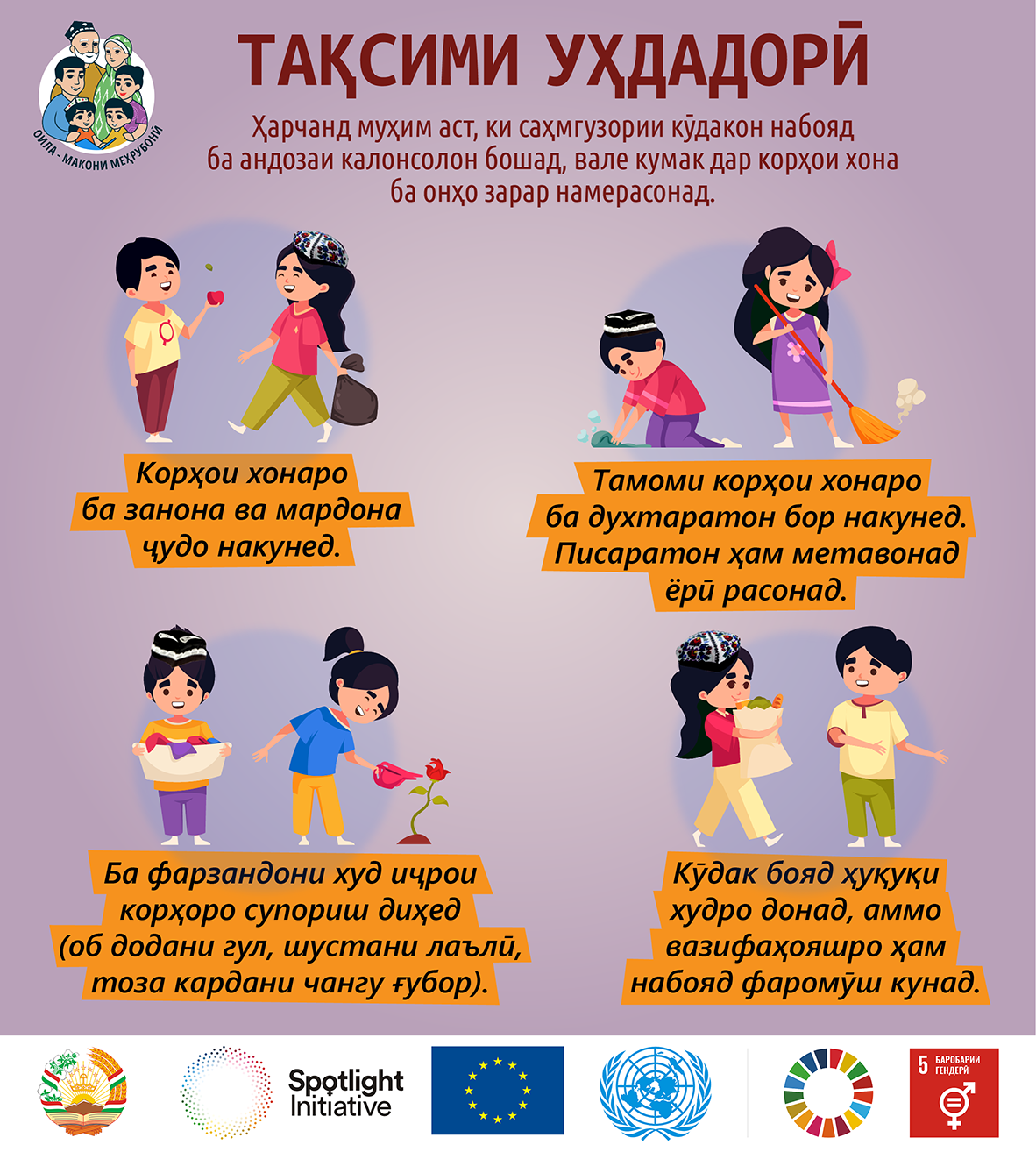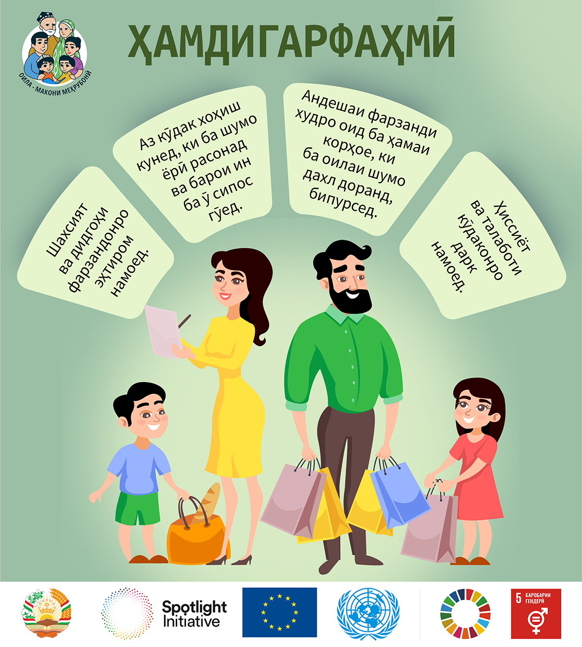 • ҳамаи калонсолони қобили меҳнати оила шуғли касбӣ доранд ва барои пешбурди рӯзгори муштарак саҳмгузоранд;