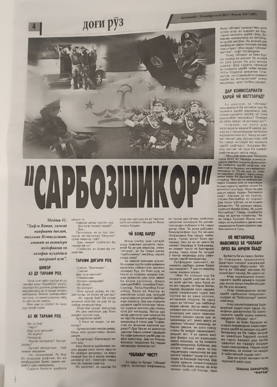Ҳафтаномаи “Фараж” матлаби асосии худро ин ҳафта ба “Сарбозшикор” бахшидааст. Дар ин матлаб оид ба як мушкили умдаи Артиш кишвар – ҷалби ғайриқонунии ҷавонон ба хидмати ҳарбӣ андешаронӣ шуда, аз Дилрабо Самадова, ҳуқуқшиноси шинохтаи тоҷик ба саволи оё метавонад мавсими даъват ба артиш бе “облава” оғоз ва анҷом ёбад посух гирифтааст.