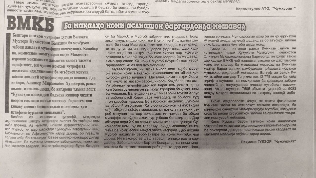 Рӯзномаи “Ҷумҳурият” (нашри 27.11.2023) мавзӯи бисёр баҳснокро мавриди таҳлил қарор додааст: “ВМКБ: ба маҳалҳо номи аслиашон баргардонида мешавад”.
