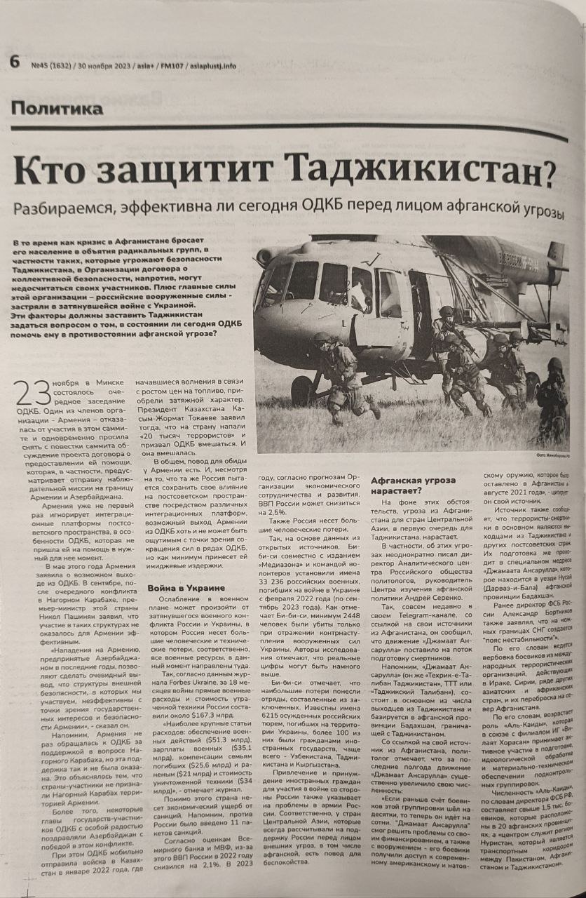 Ҳамчунин, дар матлаби “Кто защитит Таджикистан” оид ба таҳдидҳо аз сӯйи Афғонистон ва зарфияти муқовимати нерӯҳои СААД андешаронӣ шудааст. Муаллиф бо назардошти равандҳои муосири сиёсиву низомӣ дар минтақа ва ҷаҳон, ҳамчунин ҷанги идомадори Русия дар Украина талош кардааст ба ин суол посух пайдо кунад, ки кӣ Тоҷикистонро метавонад аз таҳдидҳои эҳтимолӣ ҳимоя кунад?