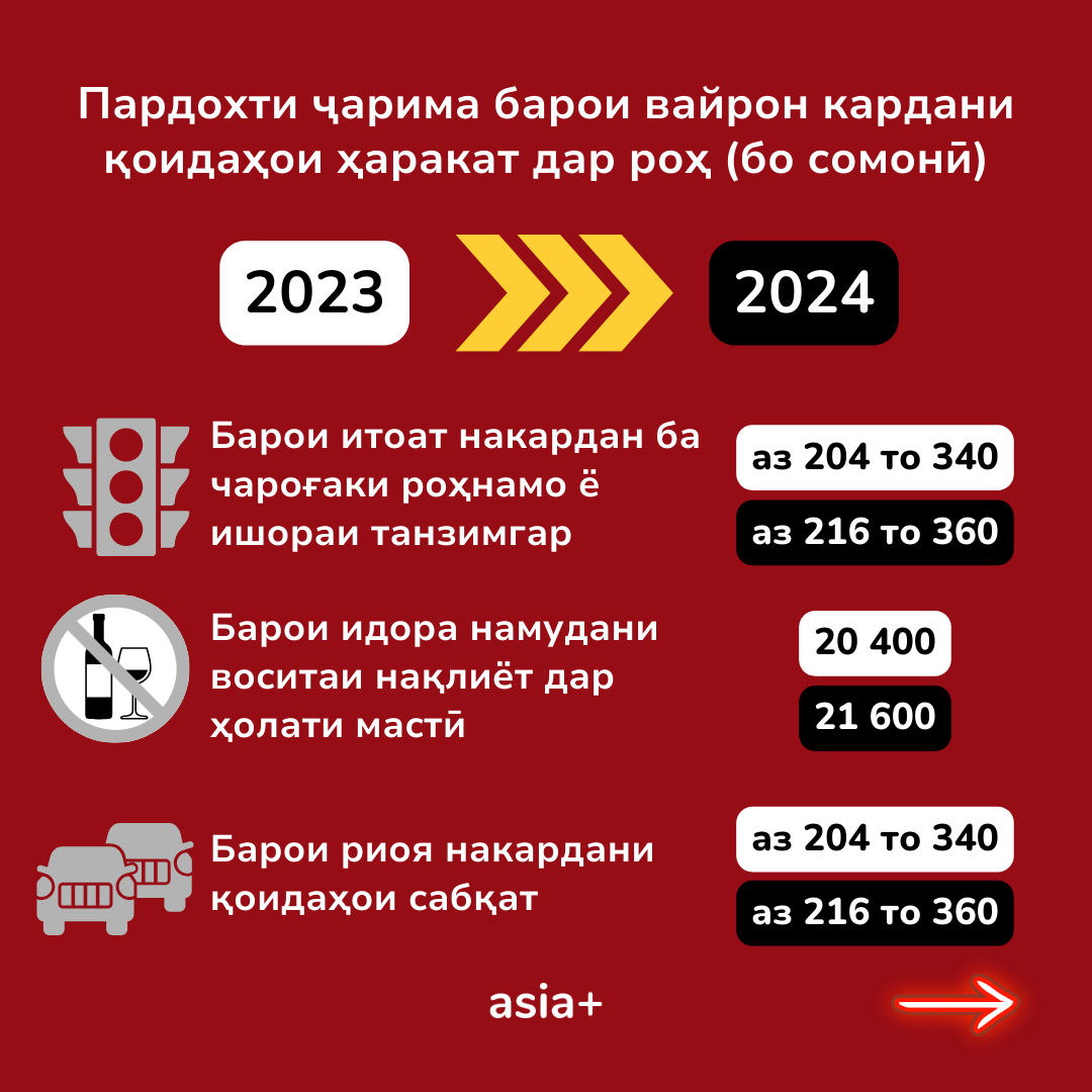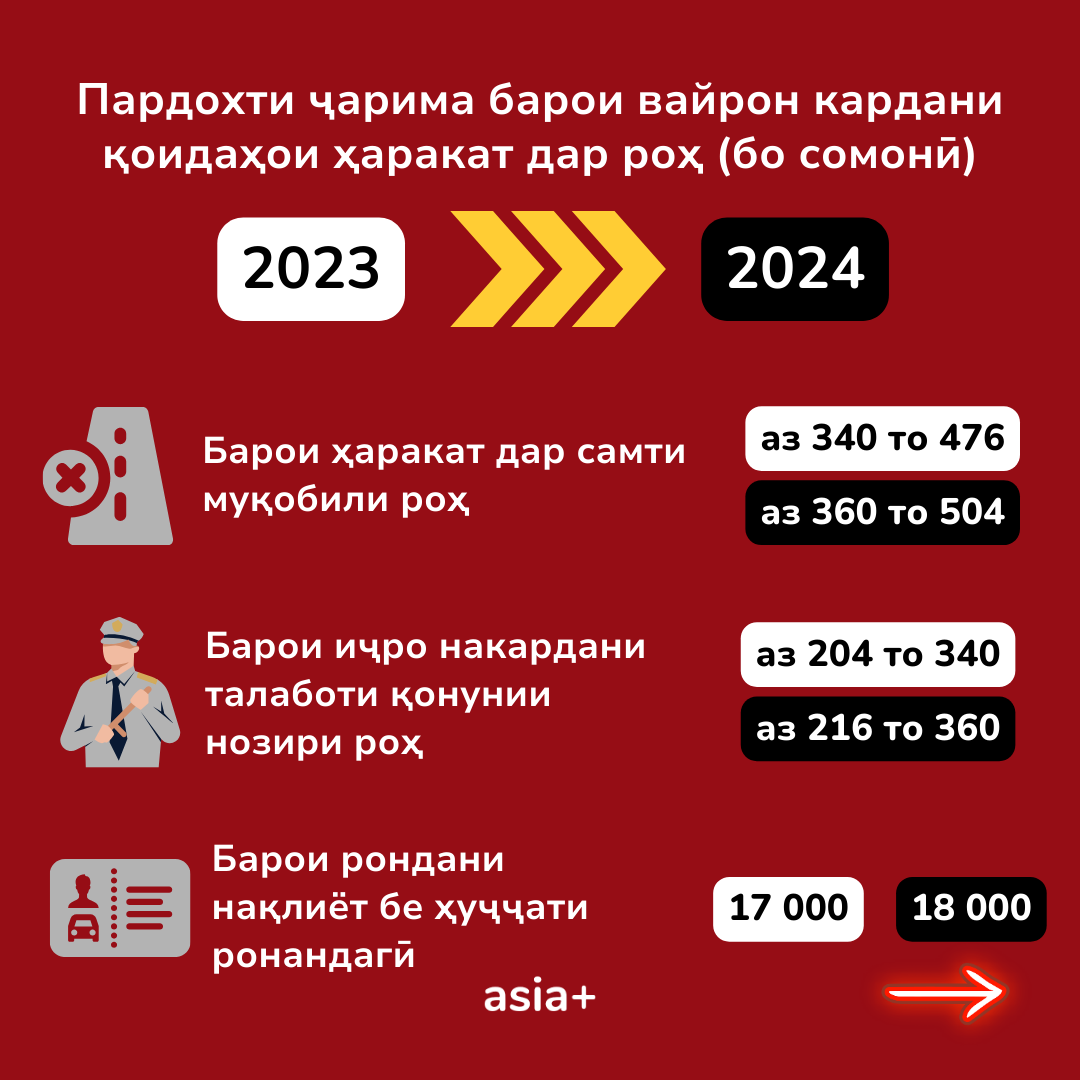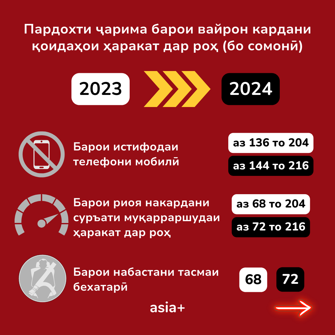Шурӯъ аз соли 2024 барои кадом қоидавайронкунӣ чанд пул ҷарима пардохт бояд кард?