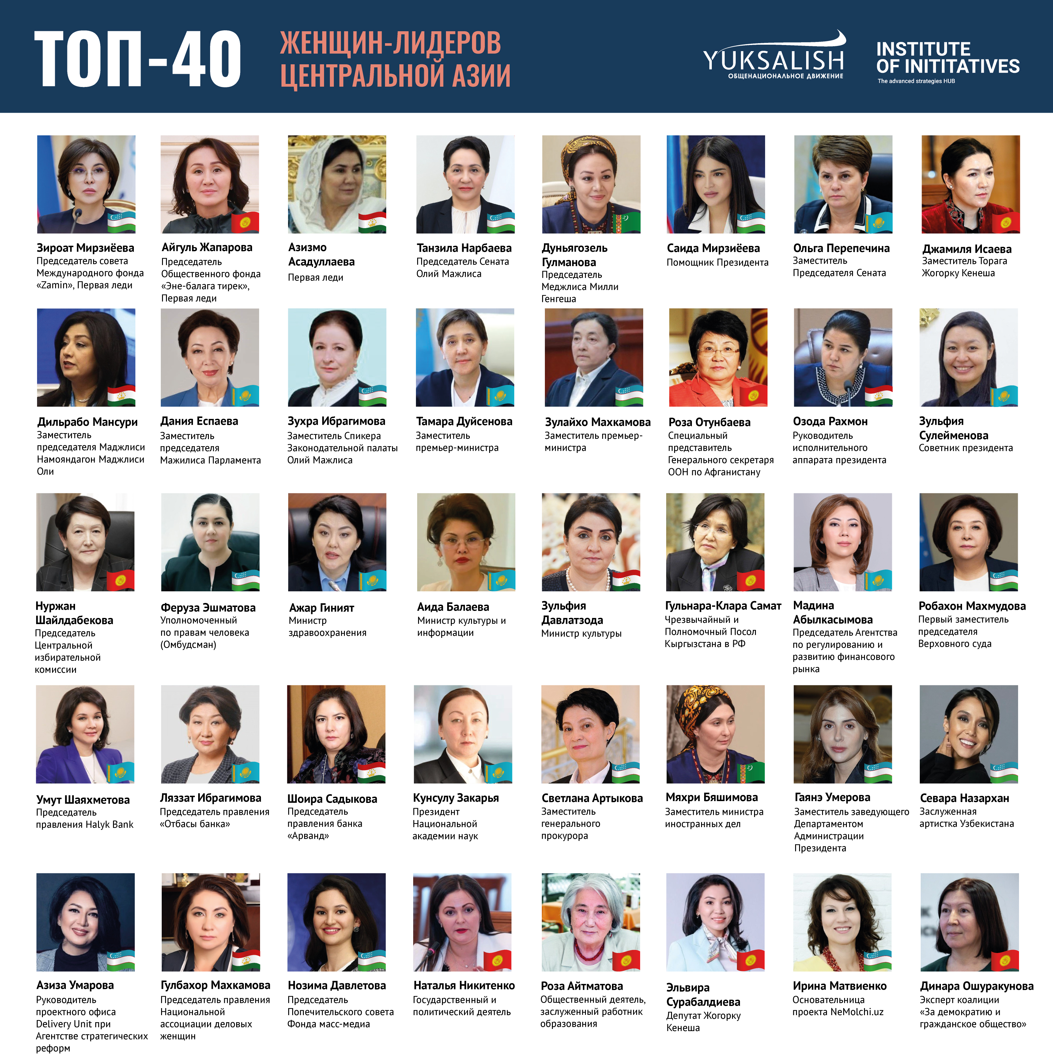Ҷунбиши миллии “Юксалиш”-и Ӯзбекистон якҷо бо Институти ташаббусҳои ҷамъиятӣ ва иқтисодӣ рӯйхати “Бонувони пешвои Осиёи Марказӣ”-ро тартиб додаанд, ки ба он номи 40 нафар бонувони шинохтаву таъсиргузори Осиёи Марказӣ ворид шудааст.