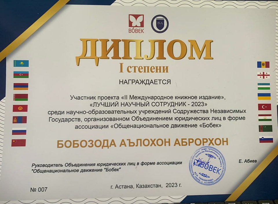 Ҳамзамон, Аълохон Бобозода – омӯзгори факултети технологияҳои инноватсионӣ ва баҳисобгирии бухгалтерии ДДҲБСТ байни муҳаққиқони давлатҳои аъзои ИДМ сазовори ҷоизаи “Беҳтарин муҳаққиқ – 2023” гардидааст.