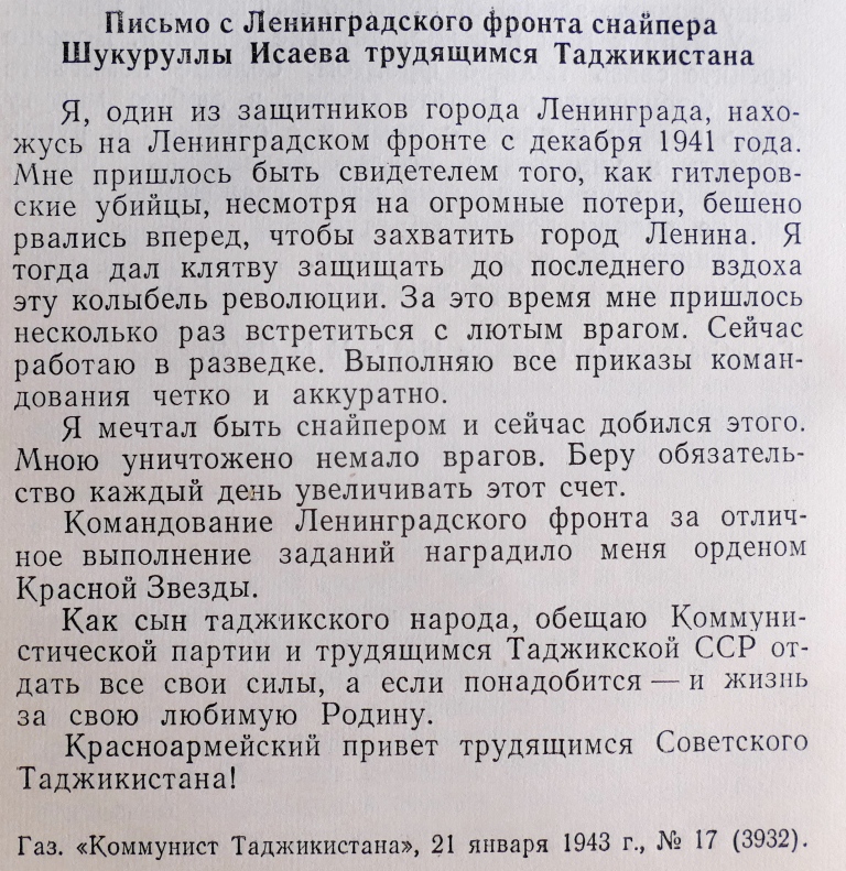 Дар фронти Ленинград мерганҳо (тирандозон) Тешабой Одилов ва Шукрулло Исоев шуҳрати зиёд доштанд. Шаҳри соҳили Неваро се бародар — афсарони артиллерия Баҳруддин, Зайниддин ва Муҳаммад Осимовҳо ҳимоя мекарданд.