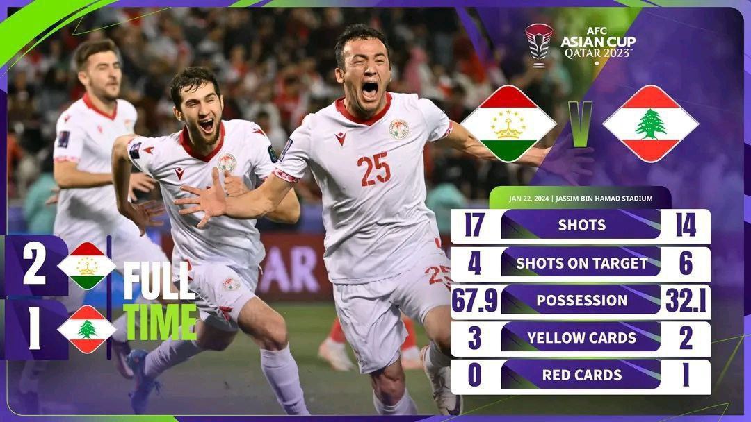 Бозии сеюми мусобиқаи Ҷоми футболи Осиё дар гурӯҳи “А” байни дастаҳои мунтахаби Тоҷикистон ва Лубнон, ки шоми рӯзи 22 январ баргузор шуд, бо ҳисоби 2 бар 1 ба фоидаи футболбозони тоҷик анҷом ёфт.