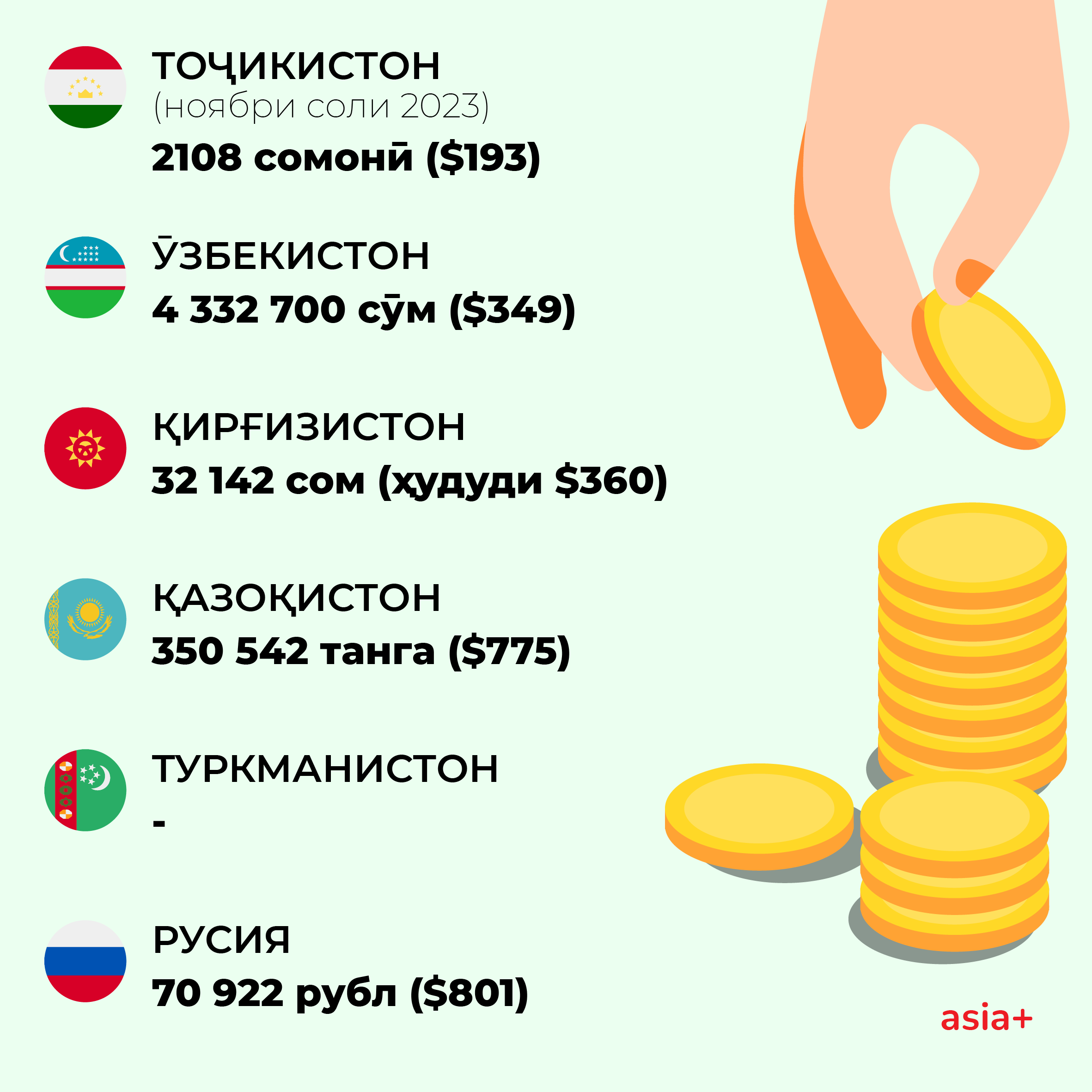 Маълумоти расмӣ оид ба Туркманистон дастрас нест, лекин баъзе такшилотҳо, масалан BDEX хабар медиҳад, ки маоши миёна дар Туркманистон дар соли 2024 (аллакай) 29 000 рубл (1 146 манат ё 327 доллар)-ро ташкил додааст.