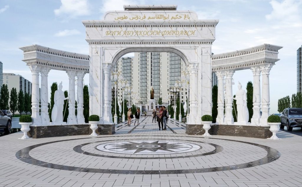 Ӯ афзуд, боғ аз майдони пазироӣ оғоз шуда, бинандагон тавассути дарвозаи баландияш 8 ва дарозии 14 метр, ки бо сутунпояҳои бузурги мармарин, нақшу ороиши миллӣ, намои муҷассамаҳои паҳлавонони достонҳои безаволи “Шоҳнома” бунёд мешаванд, ворид мегарданд.