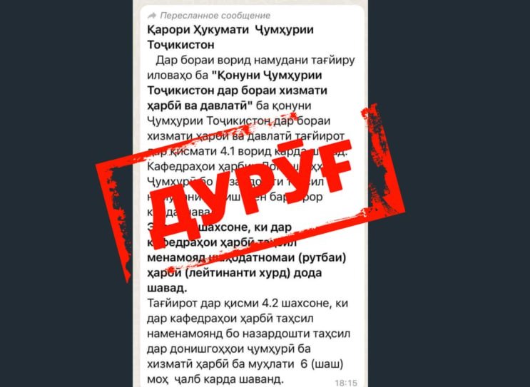 Дар шабакаҳои иҷтимоӣ хабаре паҳн шуд, ки гӯё дар ҳамаи донишгоҳҳои Тоҷикистон кафедраҳои ҳарбӣ барқарор мешаванд. “Азия-Плюс” дурустии ин хабарро санҷид ва маълум кард, ки он “фейк” будааст.