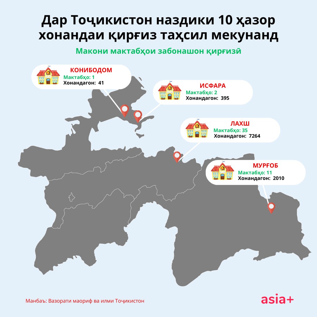 Вазорати маориф ва илми Тоҷикистон дар як посухи хаттӣ ба “Азия-Плюс” иттилоъ дод, ки ҳоло дар ҷумҳурӣ 49 мактаби забони таълимашон қирғизӣ фаъолият доранд. Ин мактабҳо дар шаҳру навоҳии марзии Лахш, Мурғоб, Исфара ва Конибодом ҷойгир мебошанд.