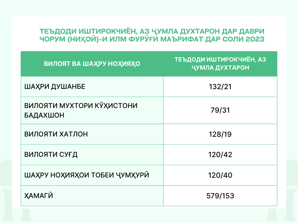 Дар озмуни ҷумҳуриявии “Илм – фурӯғи маърифат”, ки барои баланд бардоштани таваҷҷуҳи ҷавонон ба илмҳои дақиқ ва табиатшиносӣ ташкил гардид, соли 2023 153 духтарон ба даври чаҳорум роҳхат гирифтаанд, ки 26 дарсади теъдоди умумии роҳхатгирифтагонро ташкил медиҳад.
