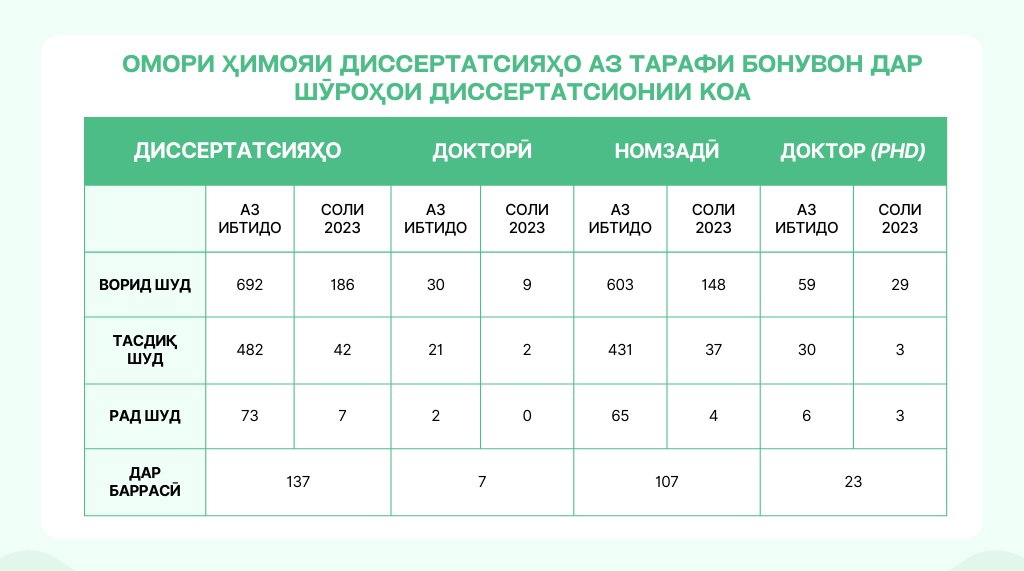 Мувофиқи омори Комиссияи олии аттестатсионии назди Президенти Ҷумҳурии Тоҷикистон (КОА) давоми соли 2023 аз ҳисоби занҳо 186 диссертатсия ворид гардидааст, ки аз он 42 диссертатсия тасдиқ ва боқимондааш дар баррасии шуъбаҳои аттестатсионӣ ва Шӯрои экспертӣ мавриди баррасӣ қарор гирифтаанд. Дар умум бошад, аз лаҳзаи ба фаъолият оғоз кардани КОА 692 нафар занон диссертатсия ҳимоя кардаанд.