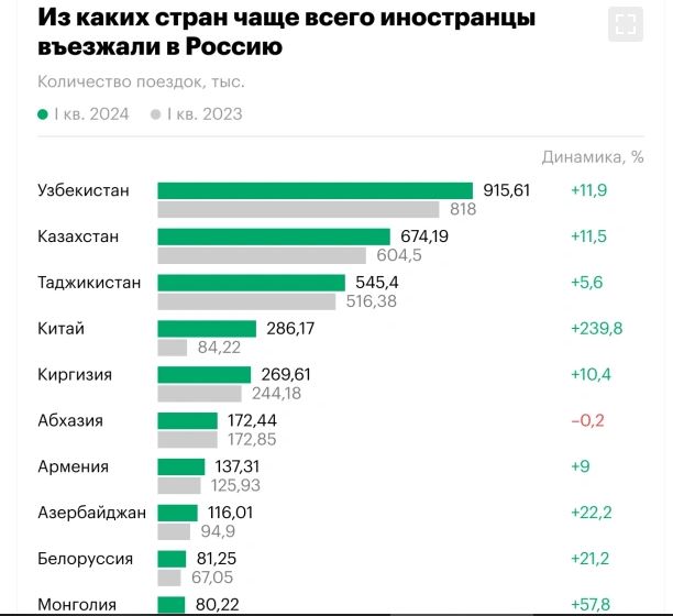 Кишвари пешсаф дар ин самт Ӯзбекистон мебошад, ки дар давраи аз моҳи январ то марти соли 2024 сарҳади Русияро 915,6 ҳазор шаҳрвандони ин кишвар убур кардаанд.