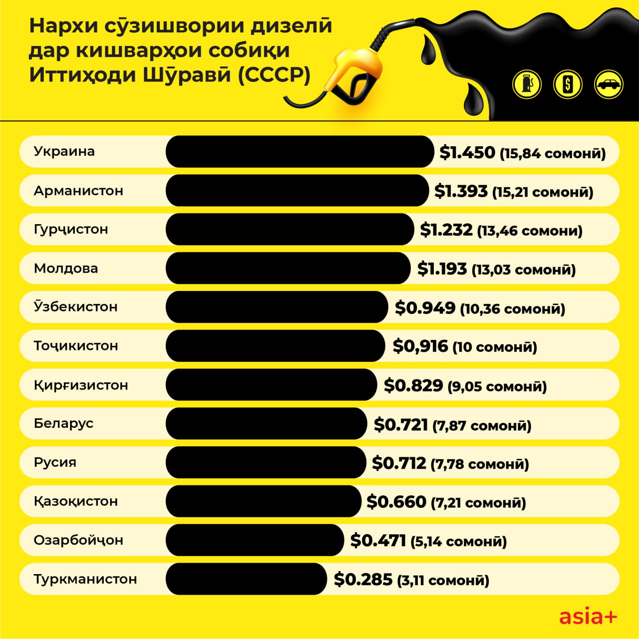 Тибқи маълумоти сомонаи Globalpetrolprices.com, нархи сӯзишвории дизелӣ дар ҷаҳон ба ҳисоби миёна 1,26 доллар (13,76 сомонӣ) барои 1 литрро ташкил медиҳад.