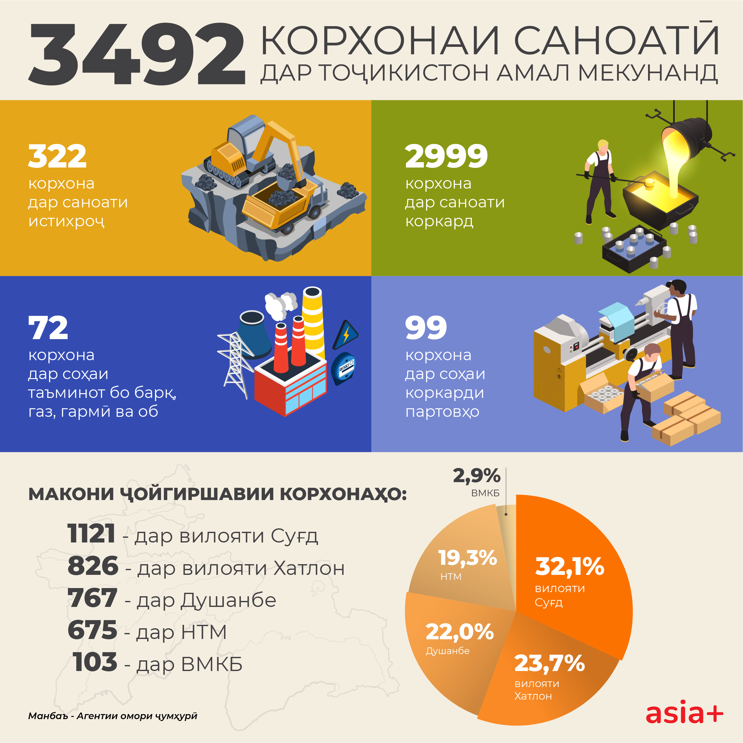 Айни ҳол ҳиссаи саноат дар ММД Тоҷикистон 16,2%-ро ташкил дода, аз рӯи ин нишондиҳанда нисбат ба бахши кишоварзӣ ва соҳаи хидматасонӣ ҳиссааш камтар мебошад.