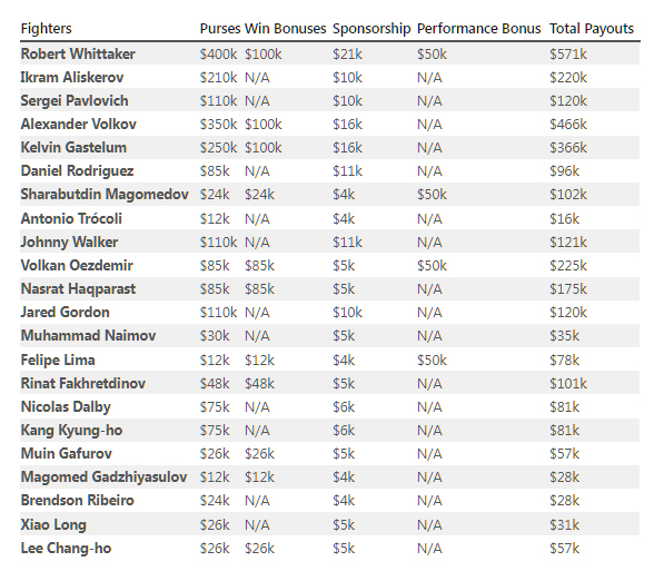 Маълумоти расмӣ дар бораи мукофотпулиҳои размикорон дар мусобиқаи гузаштаи UFC пас аз рӯйдоди асосӣ дар Арабистони Саудӣ нашр шуданд. Аз рӯи натиҷаҳои мусобиқа Роберт Уиттакер, Александр Волков ва Келвин Гастелум аз ҳама бештар мукофотпулӣ гирифтанд.