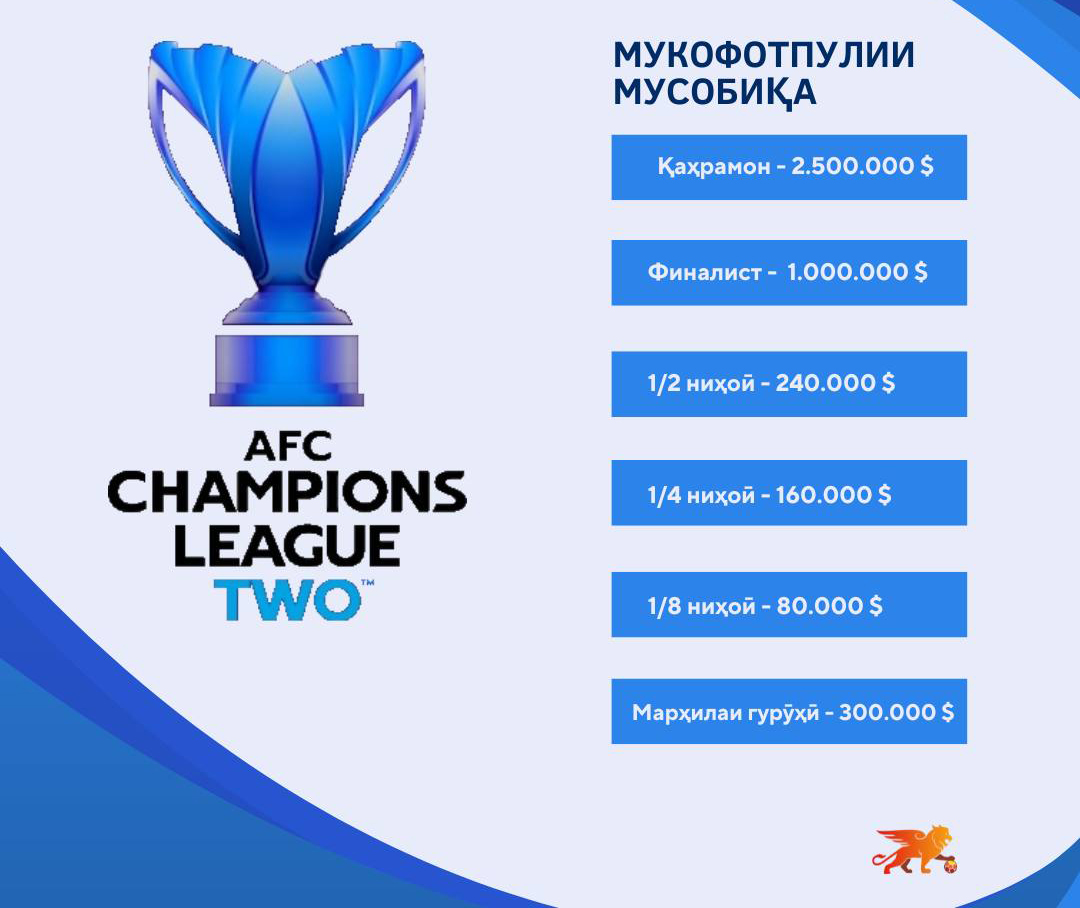 Барои ҳар як ғалаба дар бозӣ дар даври гурӯҳӣ дастаҳои Тоҷикистон метавонанд 50 ҳазор доллар мукофтпулӣ кор кунанд. Дар давраи гурӯҳӣ ҳар кадоме аз дастаҳо 6 бозӣ мегузаронанд. Ғайр аз ин, дар сурати ба даври 1/8 финалии мусобиқа роҳ ёфтан ба ҳар кадоме аз дастаҳо 80 ҳазор доллар дода мешавад.
