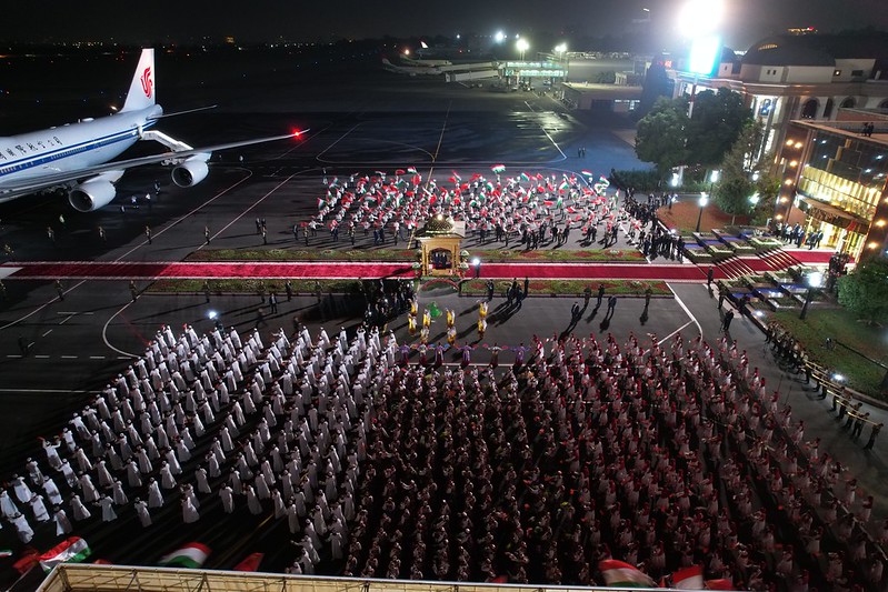 Ба ифтихори меҳмон фурудгоҳ бо парчамҳои давлатии ду кишвар, расмҳои сарони Тоҷикистону Чин ва шиорҳо дар бораи дӯстии халқҳои ду давлат оро дода шуд.