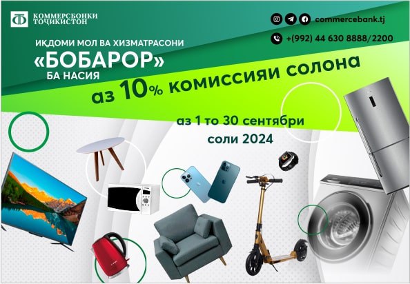 Ба ифтихори ҷашни Рӯзи Истиқлолияти Ҷумҳурии Тоҷикистон ҶСК “Коммерсбонк Тоҷикистон” аксияи нави “Бобарор”-ро роҳандозӣ мекунад. Аз 1 то 30 сентябр шумо имкон пайдо мекунед, ки молу маҳсулот ва хидматрасониҳоро бо шартҳои фоиданок тариқи қарз дастрас намоед.