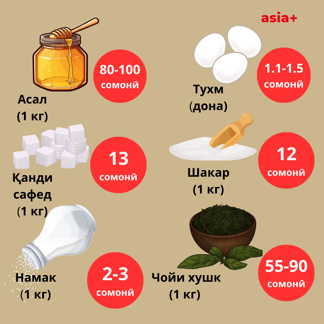 Ҳамин тариқ, дар нимсолаи аввали соли 2024 нархи гӯшти гов 13,3%, гӯшти гӯсфанд 10,8, моҳӣ 2,8%, шакар ва маҳсулоти қаннодӣ 4%, равғани офтобпараст 4,5%, равғани пахта 0,5% қиммат шудааст. Дар нимсол нархи тухм 17%, орд 4,4% ва шир 3,6% арзон шудааст.