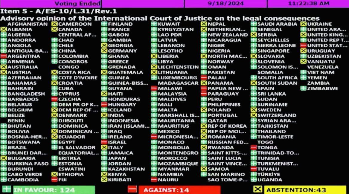 Маҷмаи Умуми Созмони Миллали Муттаҳид (СММ) қатъномаеро қабул кард, ки дар он аз Исроил хоста шудааст, дар зарфи як соли оянда нерӯҳои худро аз Фаластин берун барад.