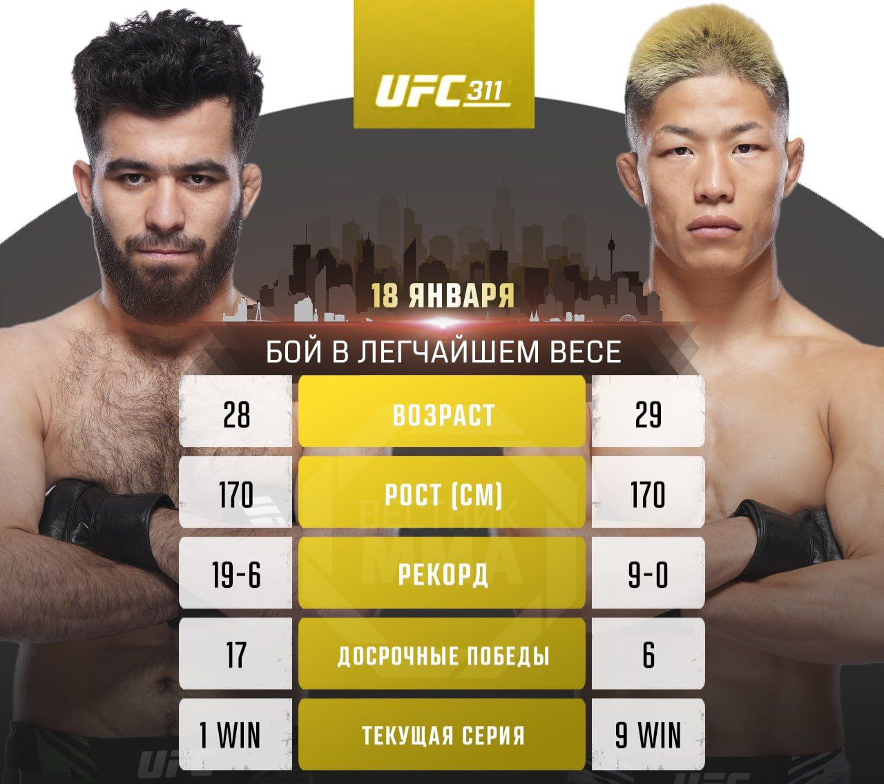 Дар мусобиқаи UFC 311 размикори тоҷик Муин Ғафуров бо варзишгари Ҷопон Риня Накамура (UFC 2-0, 9-0), ки то ҳол таъми бохтро начашидааст, рақобат мекунад.