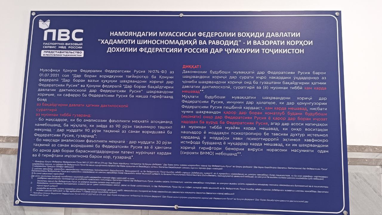 Охирҳои моҳи майи соли равон дар Душанбе намояндагии Хадамоти шиносномадиҳӣ ва раводиди Вазорати корҳои дохилии Русия боз шуд. Мақомот гуфтанд, ки шаҳрвандони Тоҷикистон имкон доранд, қабл аз сафар ба Русия дар ин намояндагӣ аз бақайдгирии изи ангушт ва санҷиши манъи вуруд ба ҳудуди Русия гузаранд.