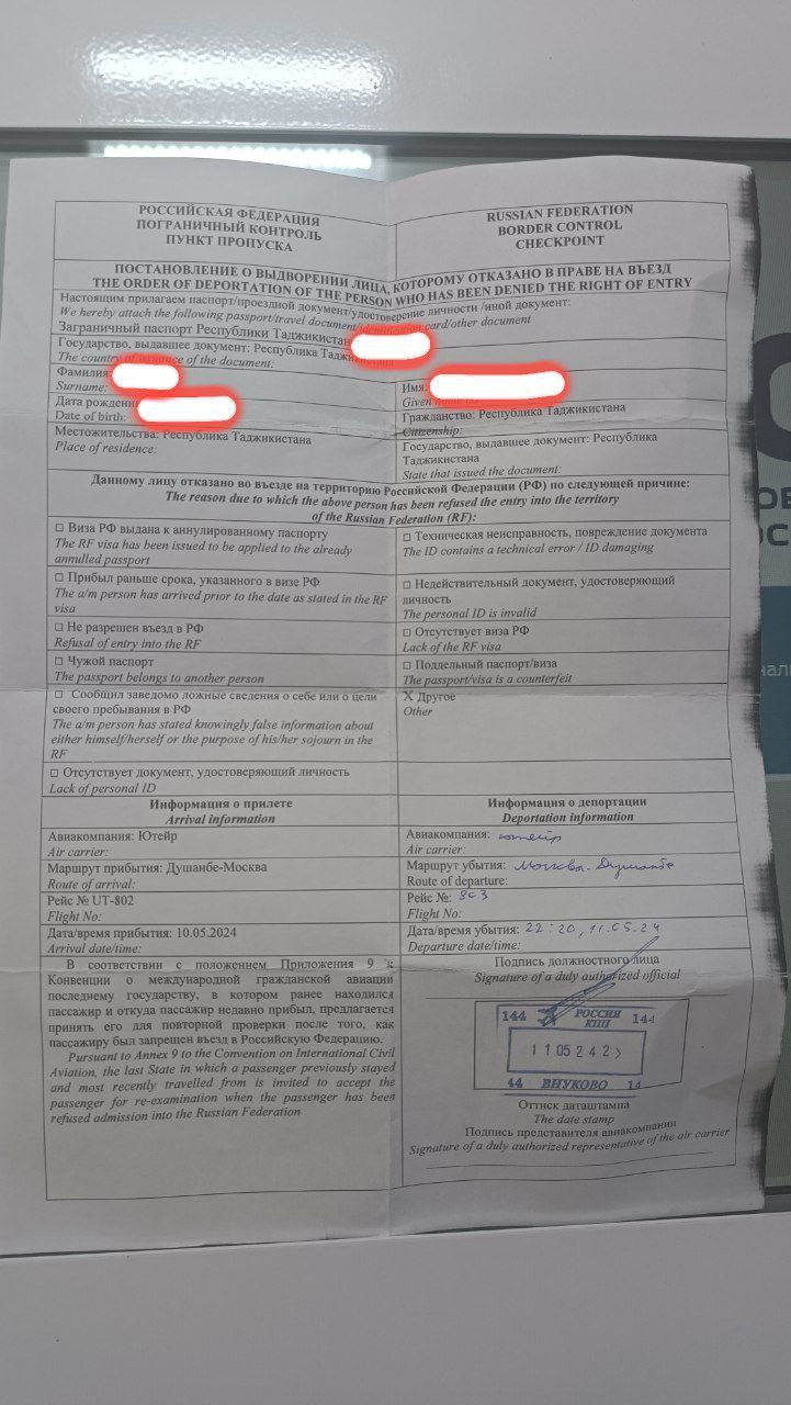 Якчанд нафар он ҷо дар даст варақае доштанд, ки мақомоти сарҳадии Русия ҳангоми ба ин кишвар роҳ надодан ва аз он ҷо ба Тоҷикистон фиристоданашон ба онҳо додаанд. Дар ин варақа қоидаҳое зикр шудааст, ки бо вайрон кардани онҳо шуморо ба Русия роҳ намедиҳанд. Вале дар варақаҳое, ки ман бо онҳо шинос шудам, мушаххас навишта нашудааст, ки ин мусофиронро барои чӣ ва барои вайрон кардани кадоме аз қоидаҳои он ба Русия роҳ надодаанд.