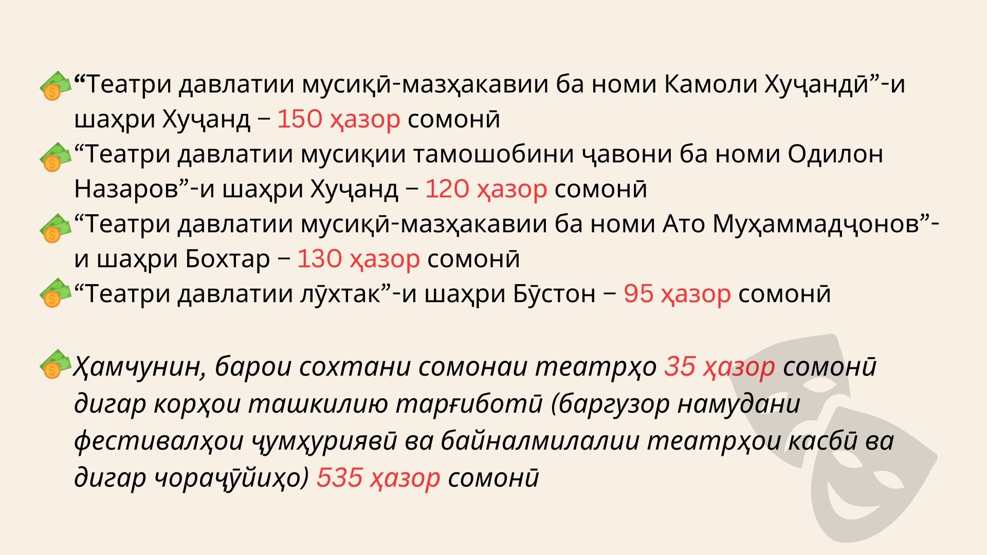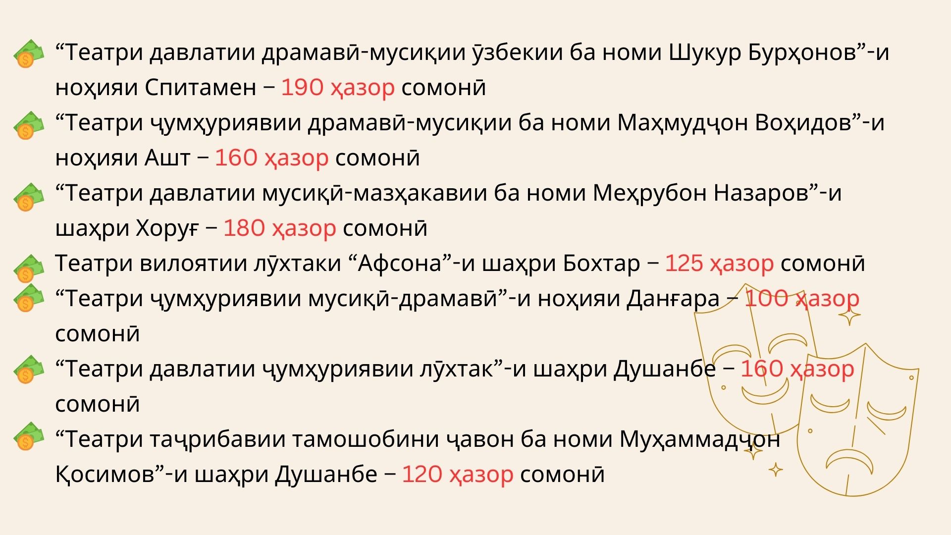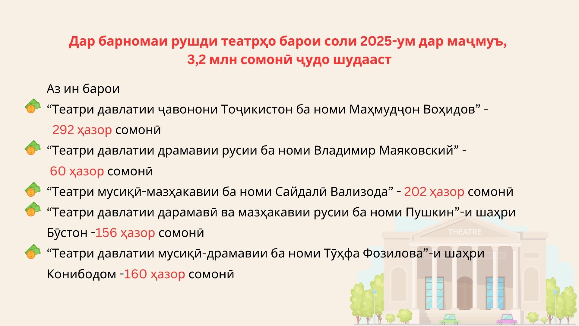 Вазорати фарҳанги кишвар нақшаи амали Барномаи рушди санъати театриро барои соли 2025 омода намуда, барои ҳар як театри кишвар маблағ ва вазифаҳои мушаххас пешбинӣ кардааст.