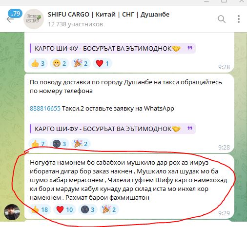 Ширкатҳои интиқоли бор аз Хитой ба суоли “Азия-Плюс” вобаста ба мушкили дар сарҳад пешомада ҷавоби мушаххас надоданд. Аксари ширкатҳои интиқолдиҳандаи бор дар эълони худ дар саҳифаҳои алоҳидаи “Телеграм” ва “Инстаграм” гуфтанд, ки ҳоло назорат дар сарҳад сангин аст ва метавонад молҳои фармоишшуда дар муддати хеле тӯлонӣ ба Тоҷикистон омада расанд. Ба ин далел наметавонанд то бартараф гардидани мушкил дар сарҳад фармоиш қабул кунанд.