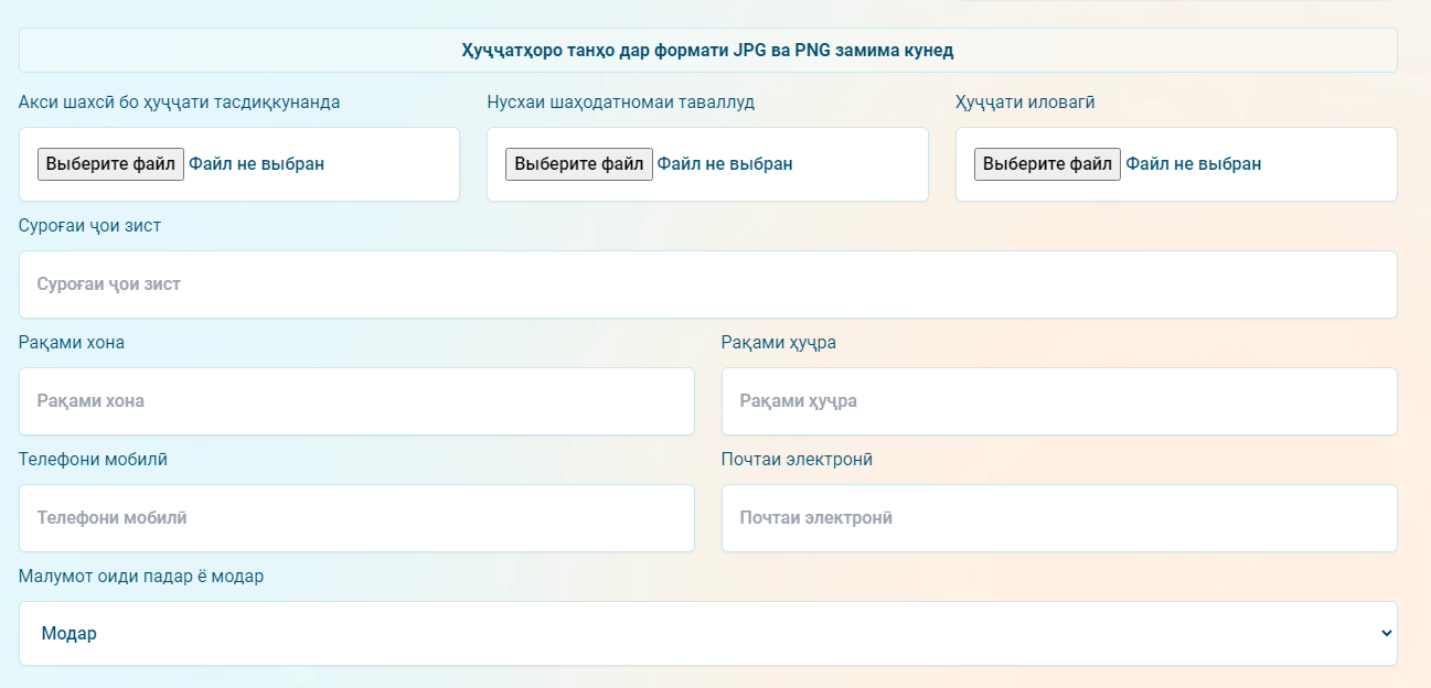 Дар қисми дуюм бошад, акси шахсӣ бо ҳуҷҷати тасдиқкунанда ва нусхаи шаҳодатнома ё шиносномаро боргузорӣ намуда, суроғаи ҷойи зист ва рақами телефону суроғаи электронии худи гирандаи РМА ё волидони ӯ ва маълумот дар бораи падар ё модарашро ишора кардан лозим аст.