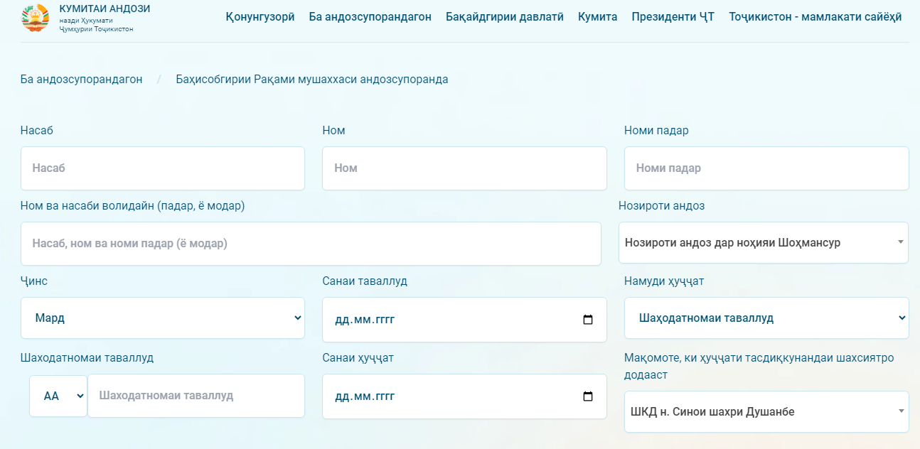 Барои гирифтани РМА дар сомонаи andoz.tj тугмаи “Шахсони воқеӣ”-ро пахш карда, “Баҳисобгирии РМА”-ро интихоб кунед. Дар экран равзана бо аризаи электронӣ кушода мешавад.