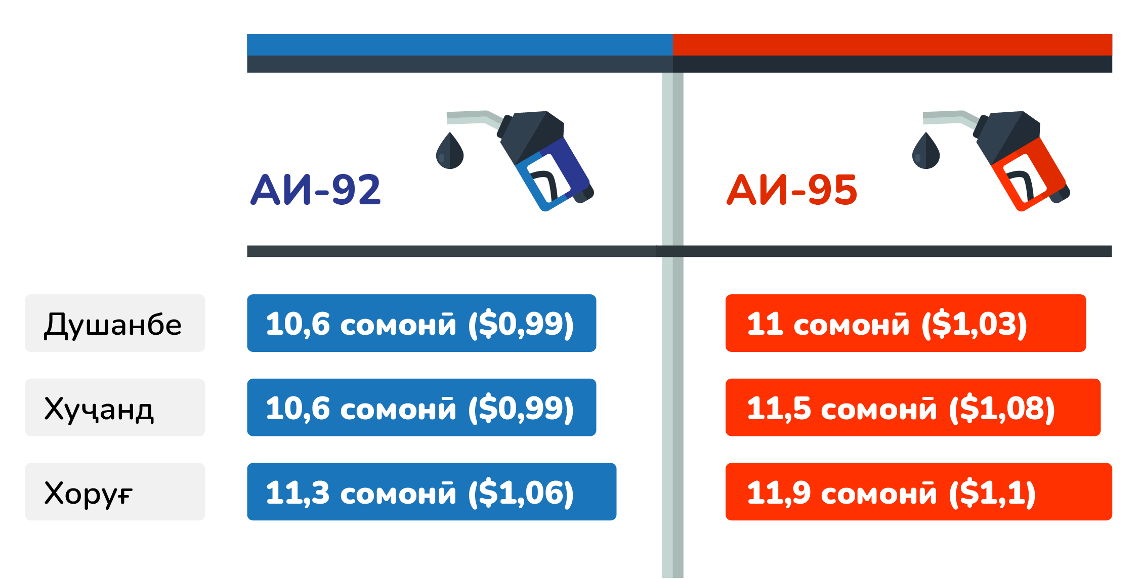 Нархи бензин дар саросари ҷумҳурӣ ба ҳисоби миёна ҳудуди 11 сомонӣ (1,03 доллар)-ро ташкил медиҳад.