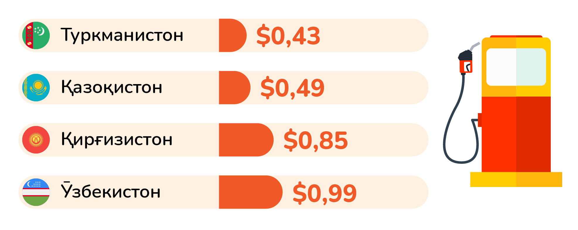 Дар Русия 1 литр бензин ба ҳисоби миёна 0,59 доллар ва дар Афғонистони ҳамсоя – 0,89 доллар нарх дорад.