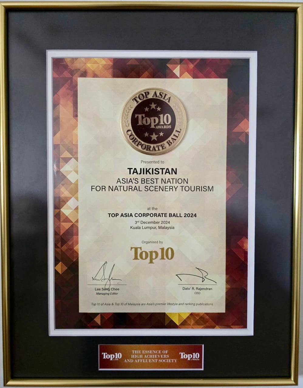 Тоҷикистон бо ҷоизаи бонуфузи сайёҳии “Кишвари дорои манзараҳои беҳтарини табиӣ дар Осиё” сарфароз гардидааст. Ҷоиза 3-юми декабр дар маросими Top Asia Corporate Ball 2024, ки дар шаҳри Куала Лумпури Малайзия баргузор гардид, ба Ардашер Қодирӣ, сафири Тоҷикистон дар Малайзия супорида шудааст.